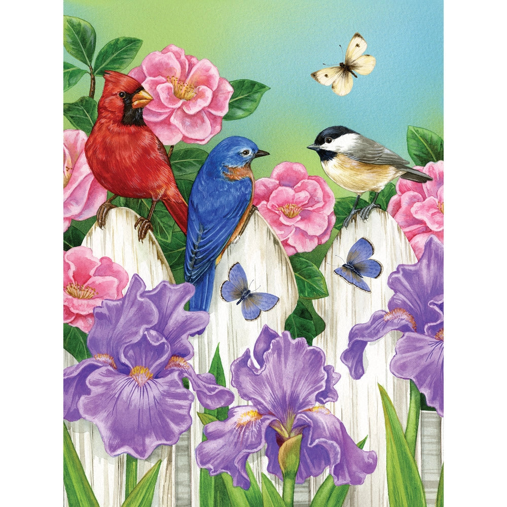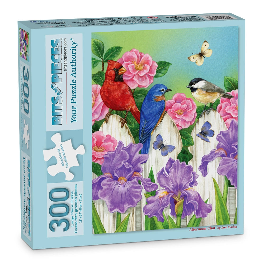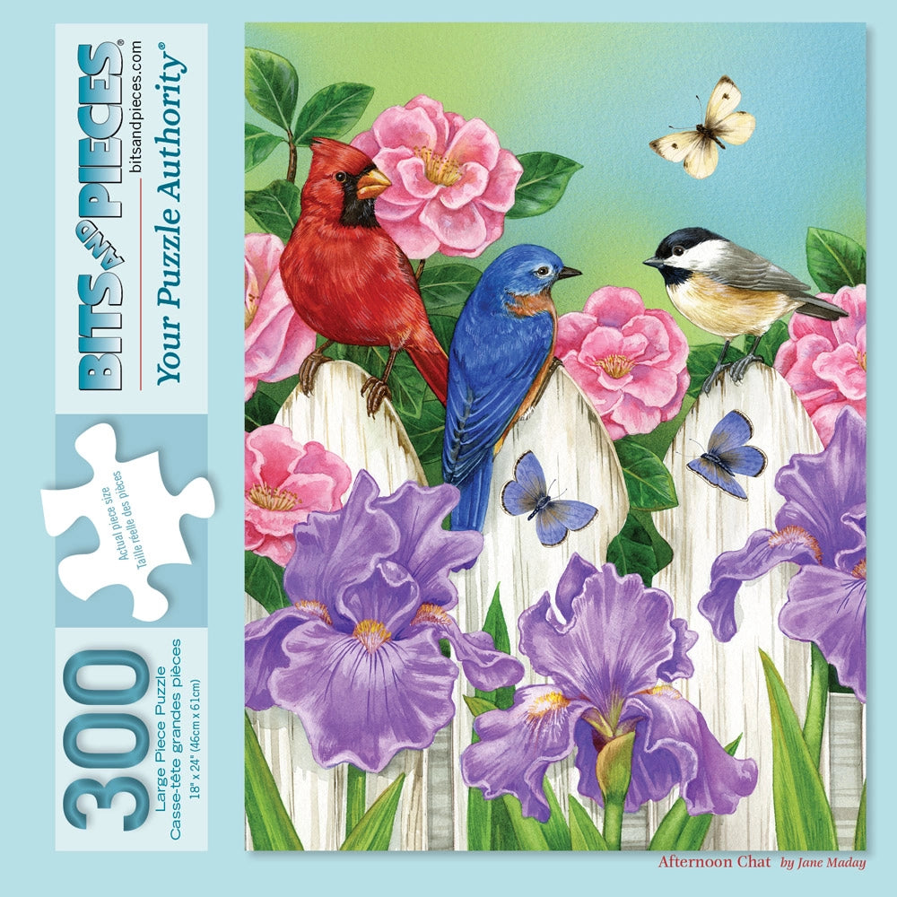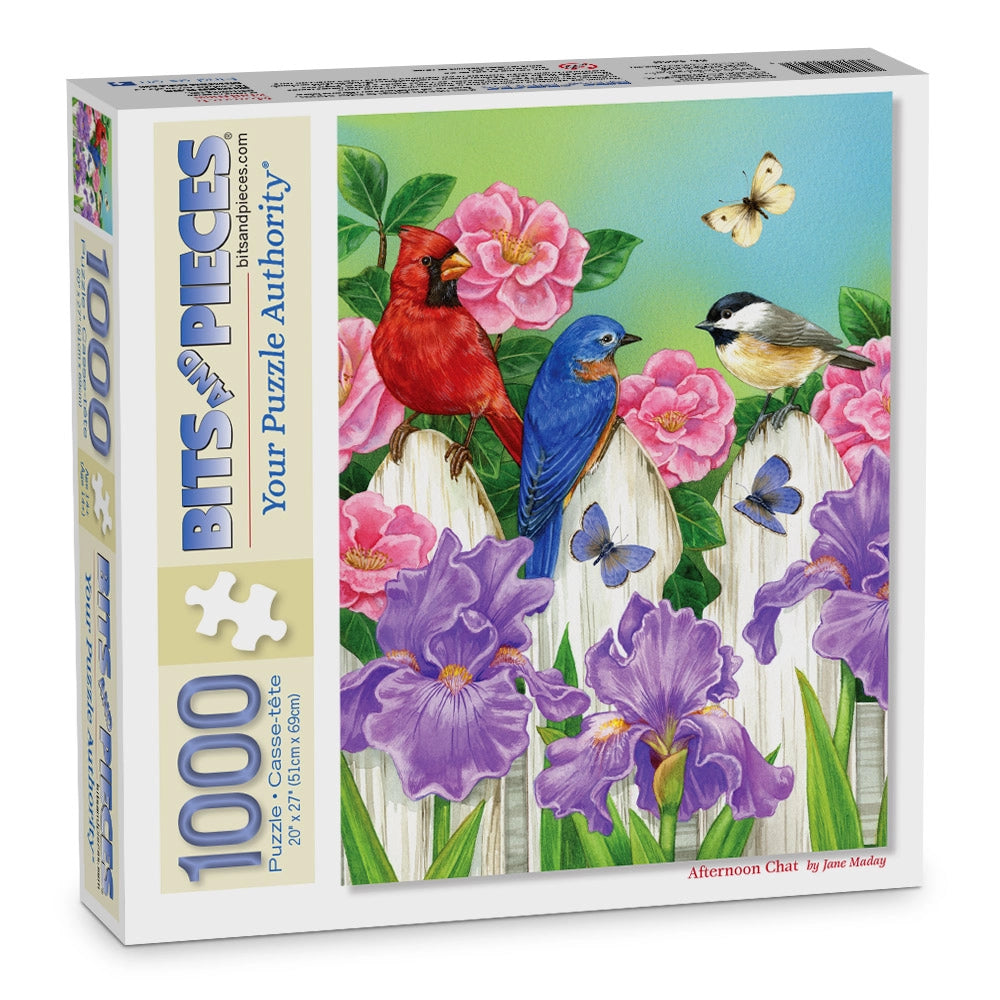 The garden is abuzz with color and conversation in Afternoon Chat jigsaw puzzle by Jane Maday. Two songbirds perch among blooming iris and peonies, joined by fluttering butterflies and the warmth of spring sunshine. Every piece of this puzzle captures the charm of backyard life, inviting you to pause and enjoy nature’s small wonders.