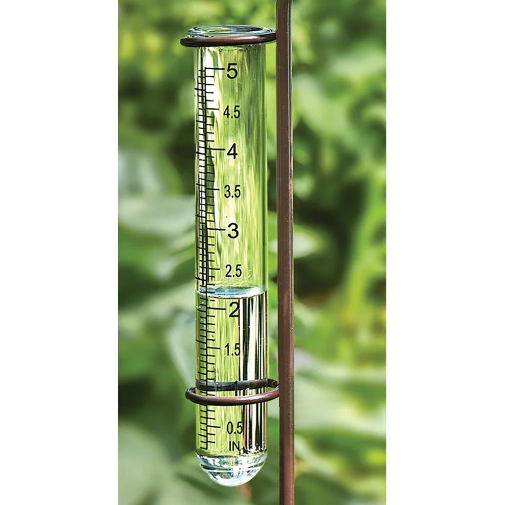 This artful rain gauge will capture and measure the rainfall in your garden. An attractive ornamental stake with hand painted metal songbird perched on the top. 5-3/4" glass tube measures rainfall in inches and centimeters. Stands 39" tall on a 4-1/2" double pronged metal stake. Minor assembly required.