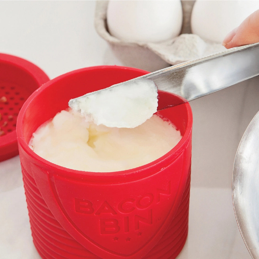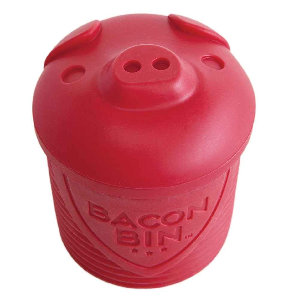 Make bacon prep and cleanup easier—and a lot more fun— with the whimsical Bacon Bin Grease Holder. Crafted from sturdy, BPAfree, FDA-approved silicone, this clever kitchen helper is designed to safely strain, store, reuse, or dispose of bacon grease without the mess. Heat-safe up to 500°F, it allows you to pour hot grease directly through the removable silicone strainer and into the bin, where it 2 Points! cools and solidifies for later use or easy disposal. The charming pigface lid seals in odors while adding a playful touch to your countertop. Dishwasher, refrigerator, freezer, and microwave safe. Holds up to a cup of grease and measures 4”h.