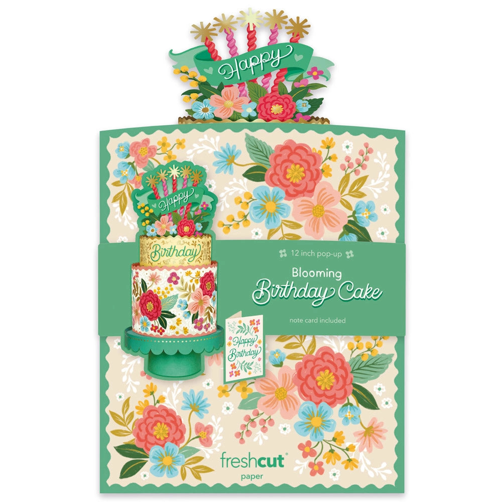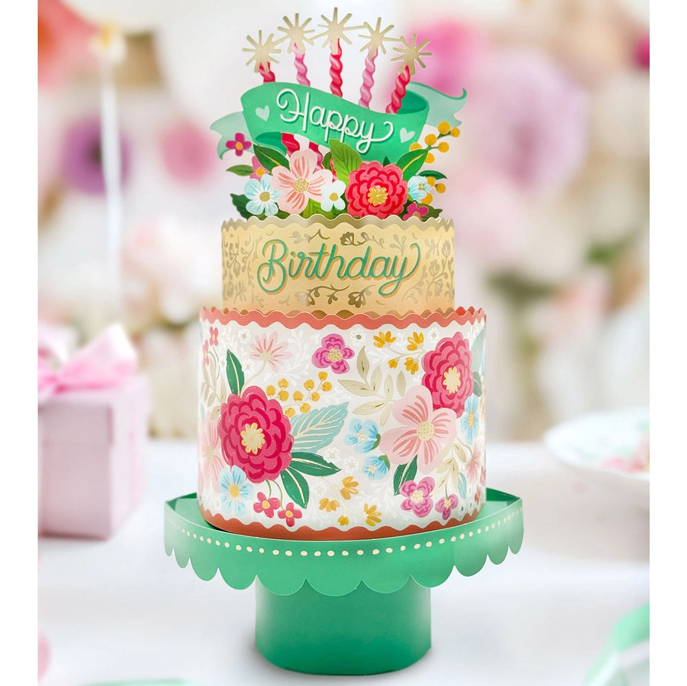 Make their birthday extra sweet with the Blooming Birthday Cake, a joyful two-tier pop-up bursting with bright florals, shimmering gold foil, and candlelit charm. As it unfolds, this delightful paper cake stands 12 inches high and 7 inches across, creating a celebration they can display long after the last slice is gone.