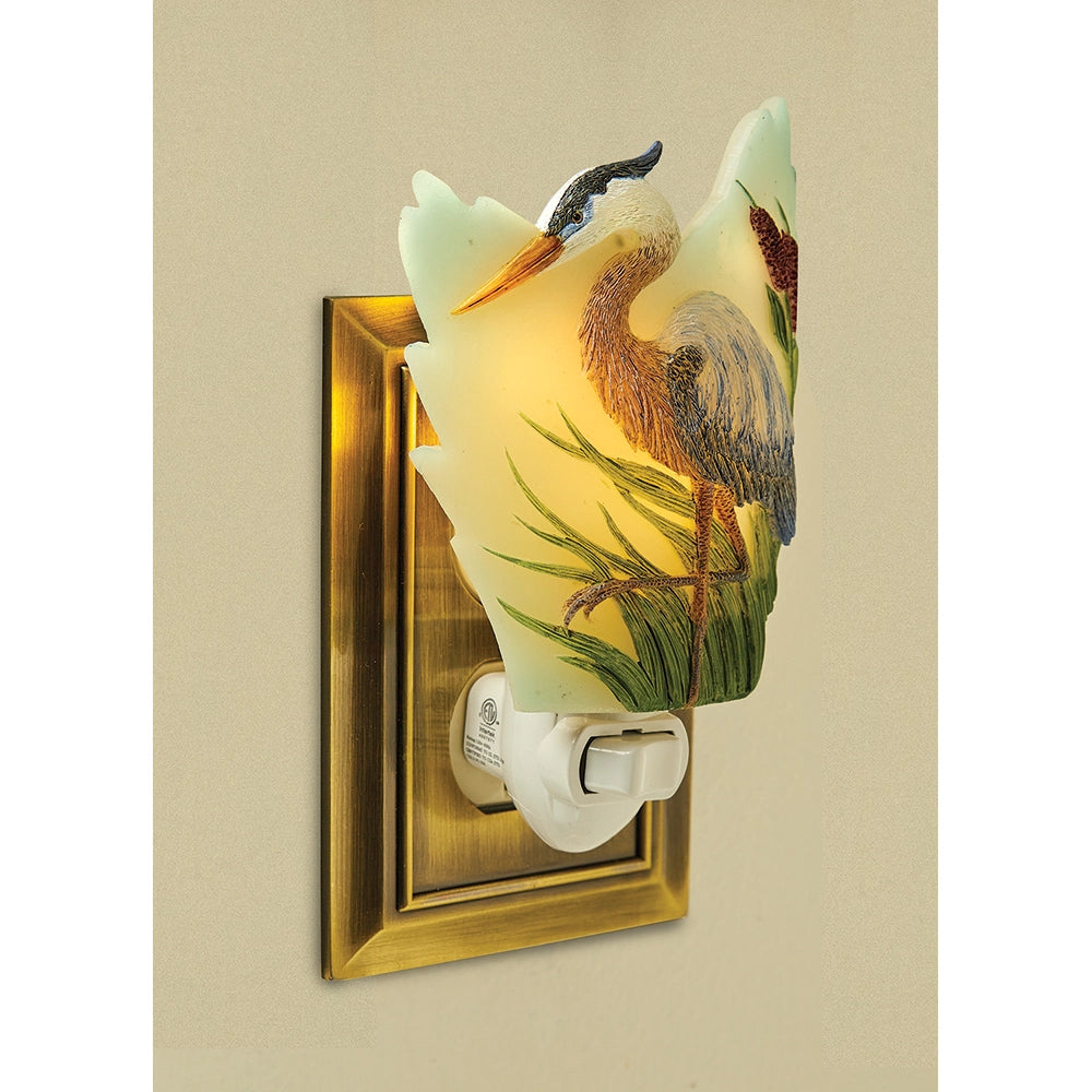 Bring the peaceful charm of the waterfront into your home with the Blue Heron Nightlight. Sculpted from durable resin and finished with feather-like details, it casts a soft, warm glow through its wing-shaped shade. Perfect for hallways, bedrooms, or guest spaces, this nightlight offers gentle illumination without being too bright. Includes E12 0.5W LED bulb. Measures 5 inches high by 3-1/2 inches wide.
