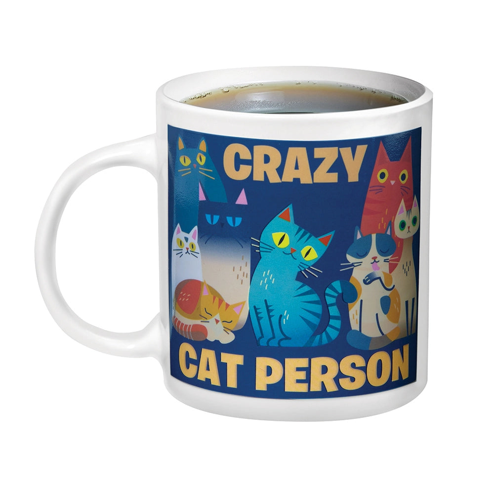 Show off your feline devotion-one sip at a time! Our playful Crazy Cat Person Mug features a charming cat illustration with the simple declaration “Cat Person”. But pour in your favorite hot beverage and watch the magic happen: the design transforms as more adorable cats appear, along with the word “Crazy” above them. Suddenly, your mug proudly reads “Crazy Cat Person” because let’s be honest, you’re in good company. Holds 11 oz. Hand wash.