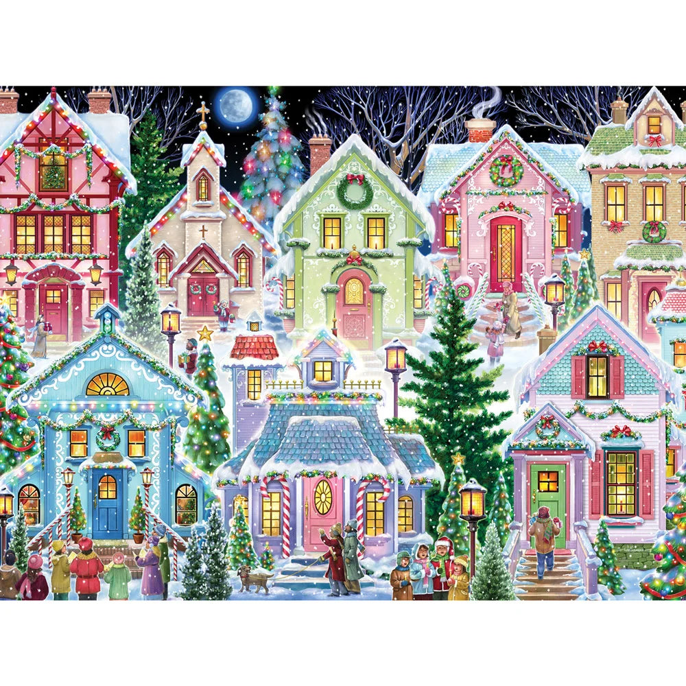 Light up your puzzle table with Christmas Houses by Randy Wollenmann. These brightly decorated homes glow against a snowy night sky, each one unique and full of charm. It’s a festive stroll through a joyful neighborhood bursting with color, twinkling lights, and seasonal spirit.