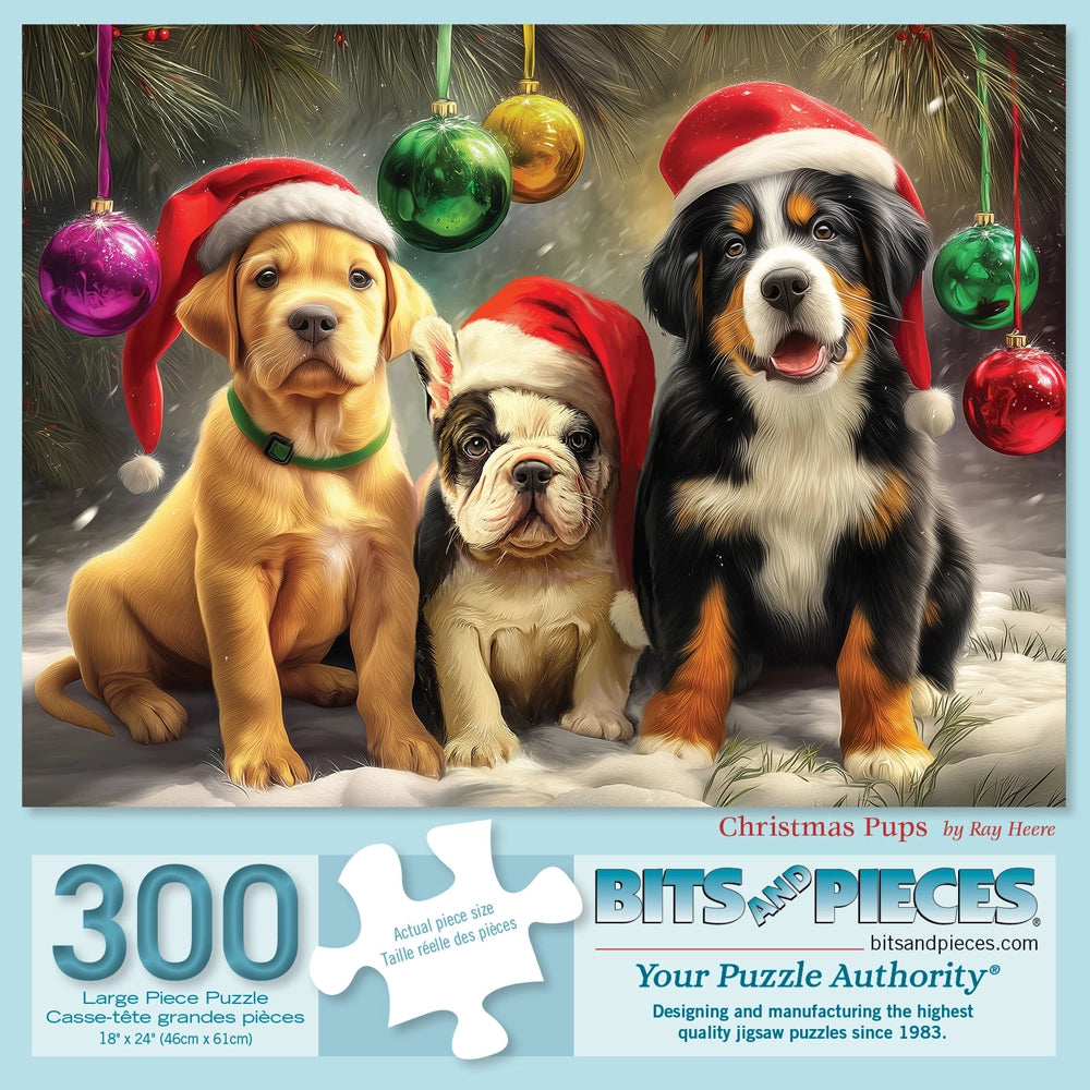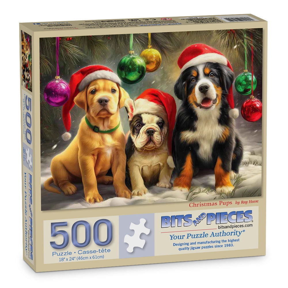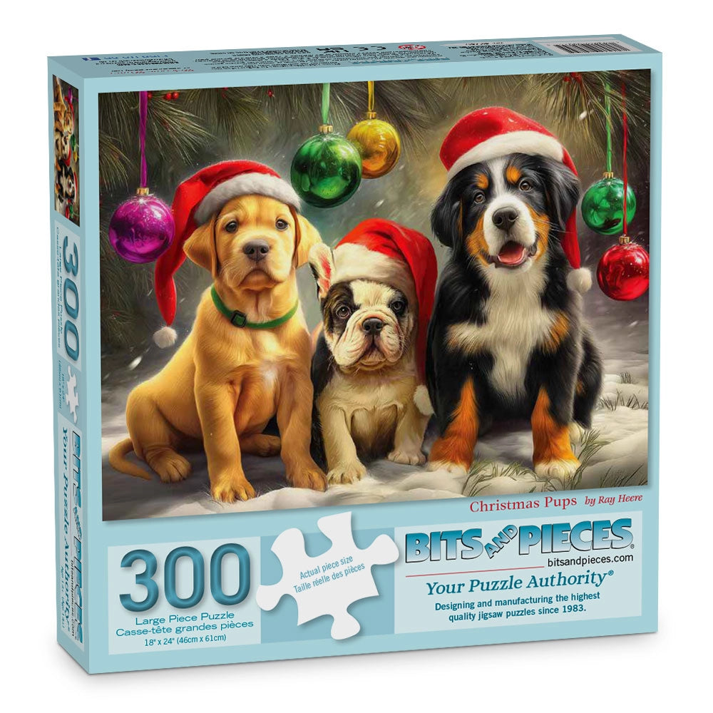 Christmas Pups by Ray Heere is full of tail-wagging holiday joy. Three adorable puppies pose under twinkling ornaments, bundled in Santa hats and surrounded by festive sparkle. With soft fur, bright eyes, and playful charm, this puzzle is a feel-good favorite for dog lovers and Christmas fans alike.