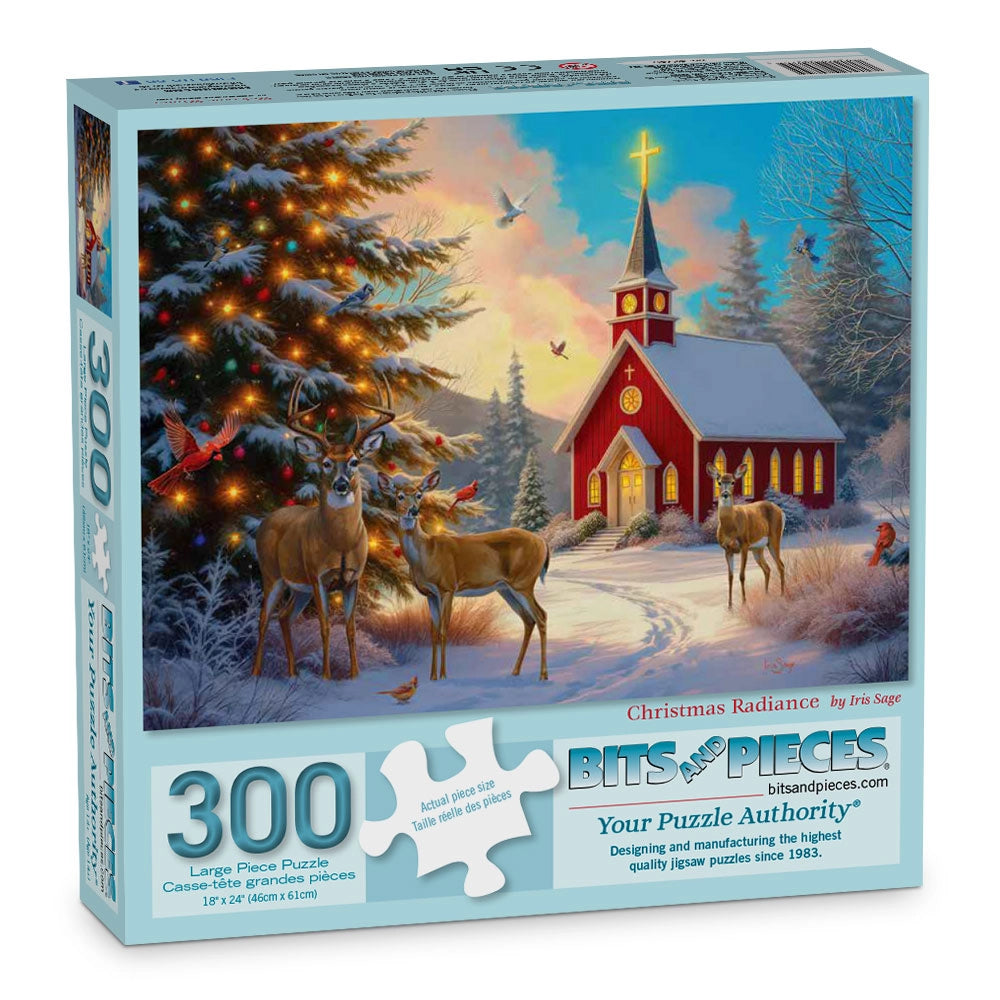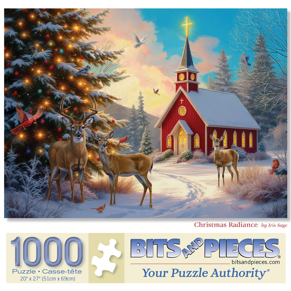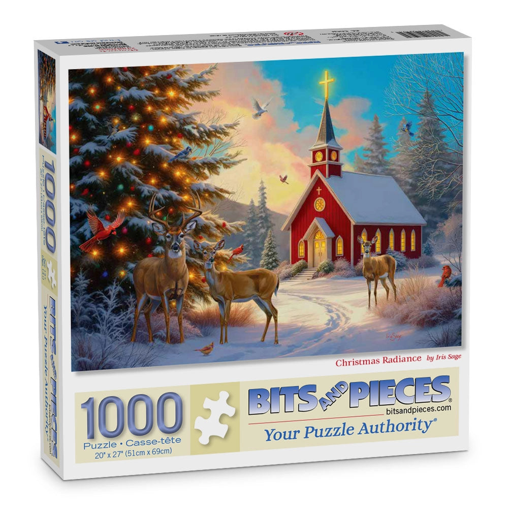 The Christmas Radiance puzzle by Iris Sage centers on a country church glowing with golden light. Snow falls softly around the steeple as deer pause to take in the peace. A nativity stands gently in the snow, reminding us of the season’s quiet beauty and meaning.