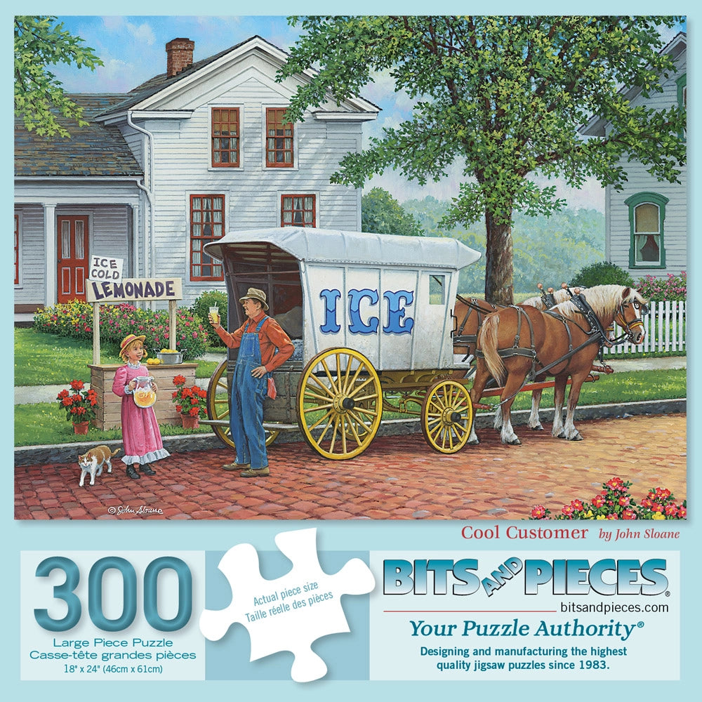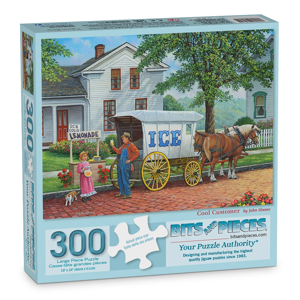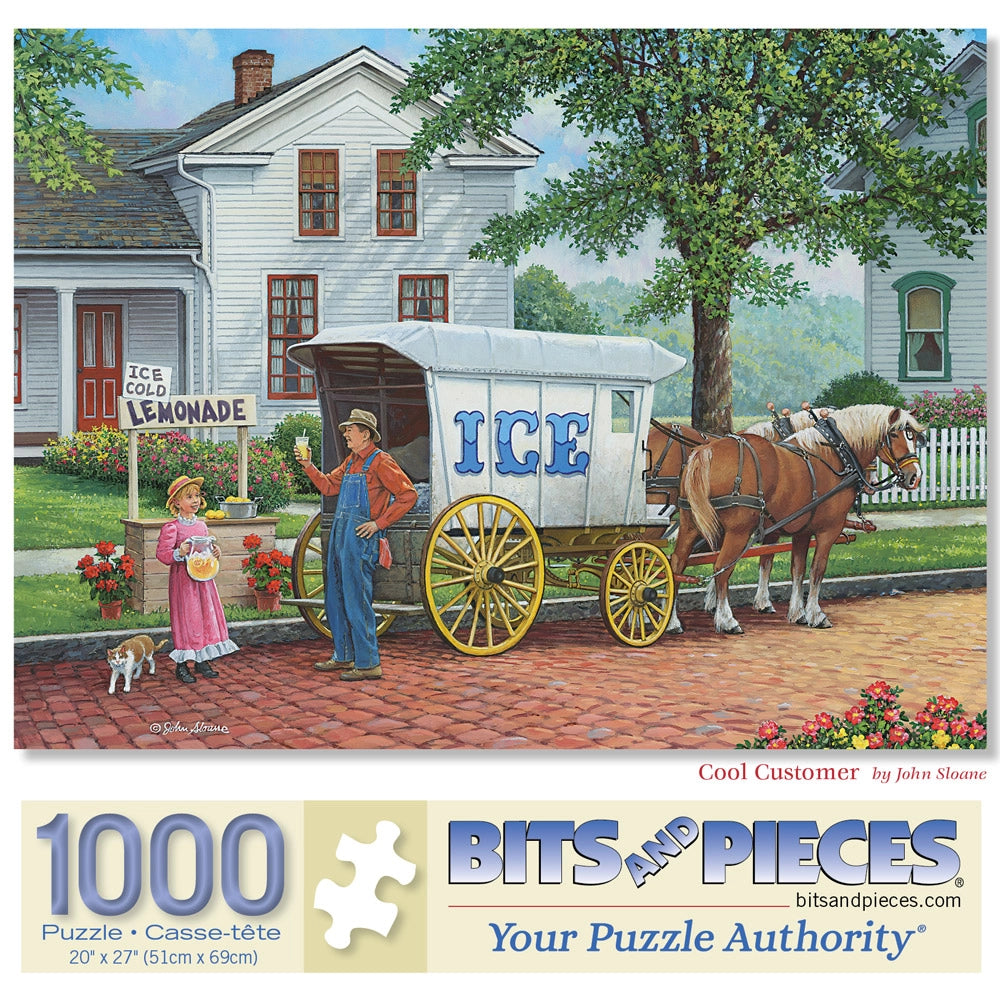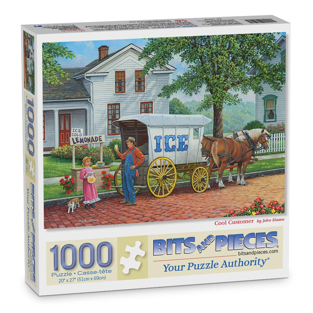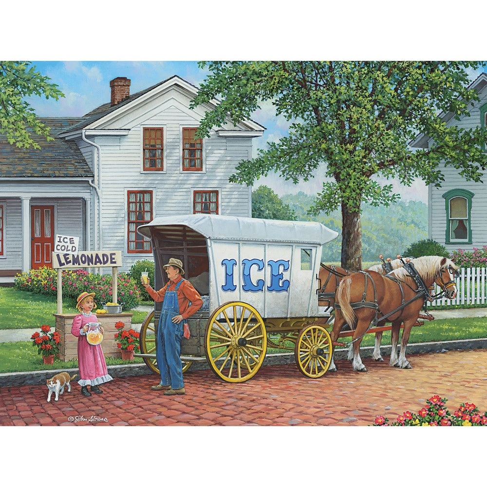 The ice man is making his rounds in Cool Customer by John Sloane. A horse-drawn wagon delivers fresh ice to a shaded porch, while children gather with wide eyes and summer curiosity. This nostalgic jigsaw puzzle captures a slice of small-town life before freezers and air conditioning.