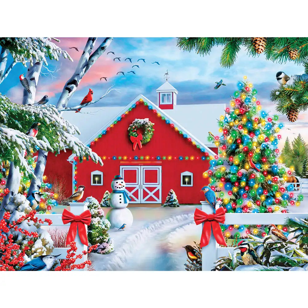 Celebrate the magic of the season with Alan Giana’s festive winter scene, where a bright red barn stands against a snowy landscape, adorned with twinkling Christmas lights and a welcoming wreath. A beautifully decorated tree glows with colorful bulbs, while a cheerful snowman adds charm to the wintry setting. Surrounding the barn, an array of vibrant birds—including cardinals, chickadees, and blue jays—perch among snow-dusted branches, bringing life to the peaceful countryside. Perfect for holiday puzzling, this enchanting image captures the joy and warmth of a cozy winter wonderland.