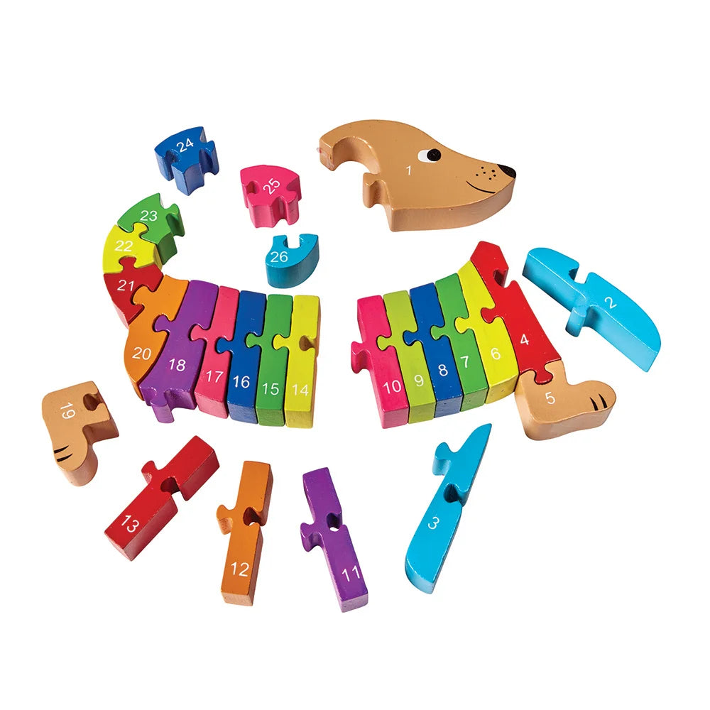 Learning made fun! This charming shaped wooden puzzle helps kids discover their ABCs and 123's while practicing their fine motor skills. Each colorful wooden piece is painted with non-toxic, bright hues that capture their imagination while keeping things safe. The reversible pieces will only fit in the correct order of the alphabet, with numbers on the reverse side. Crafted from thick composite wood, this durable puzzle measures 5" tall x 11-1/4" wide x 3/4" thick. Perfect for little learners ages 3 and up!