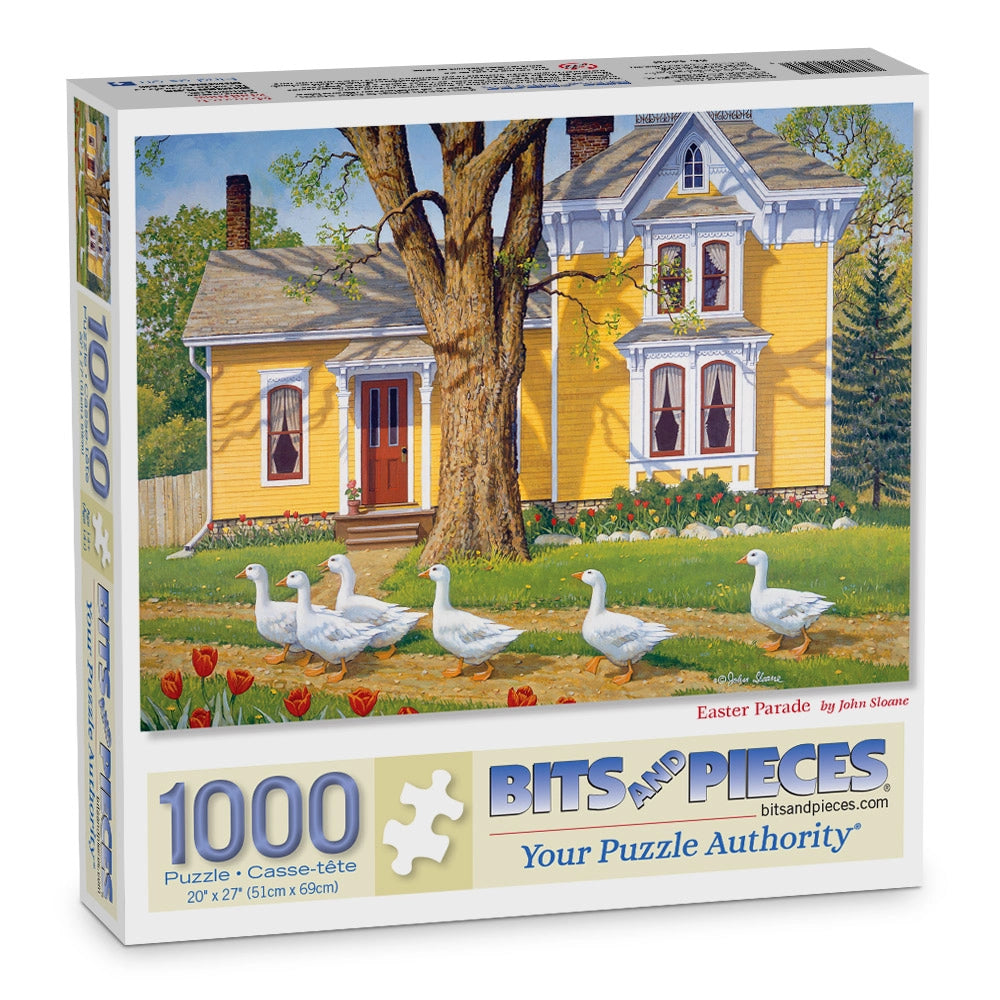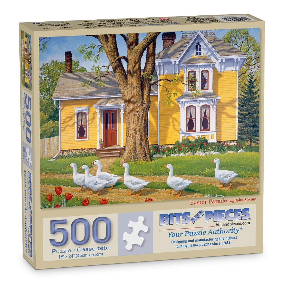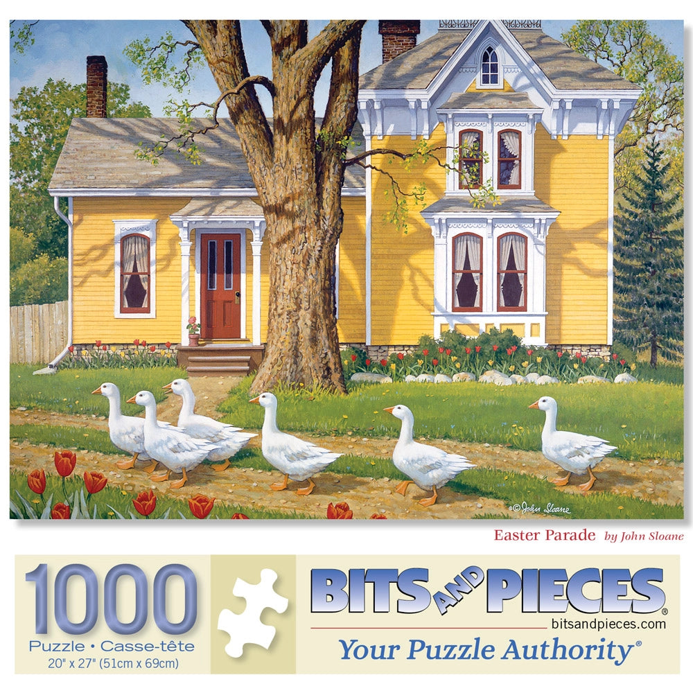 Geese march proudly past a grand Victorian home in Easter Parade by John Sloane. Tulips line the path, spring sunshine warms the porch, and yellow siding glows in the light. This jigsaw puzzle is full of cheerful color, whimsical charm, and the spirit of the season.