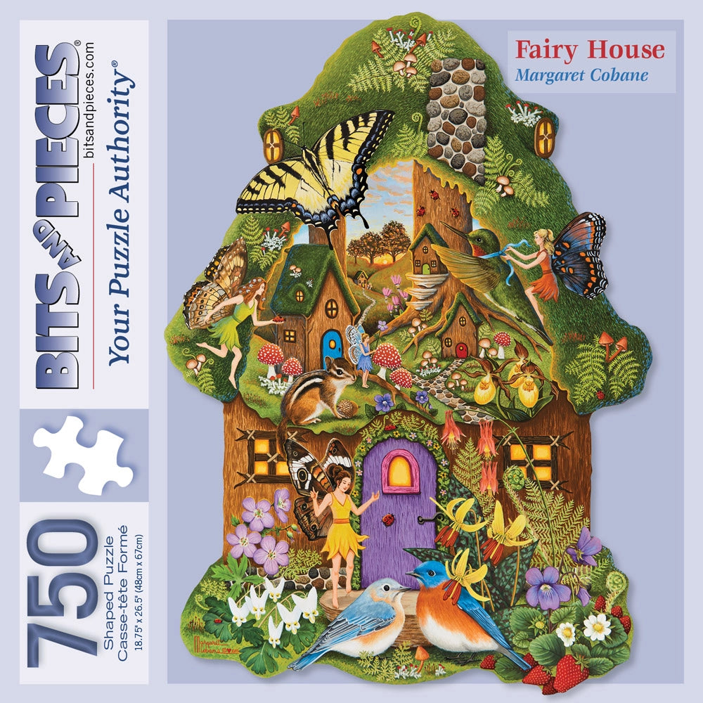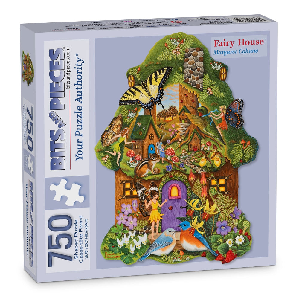 Step into a world of whimsy with the Fairy House Shaped Puzzle by Margaret Cobane. This enchanting jigsaw puzzle takes you deep into a storybook forest, where fairies dance among wildflowers, butterflies glide through the air, and birds perch outside cozy cottages. With its charming shape and rich detail, this puzzle is a magical adventure waiting to unfold.