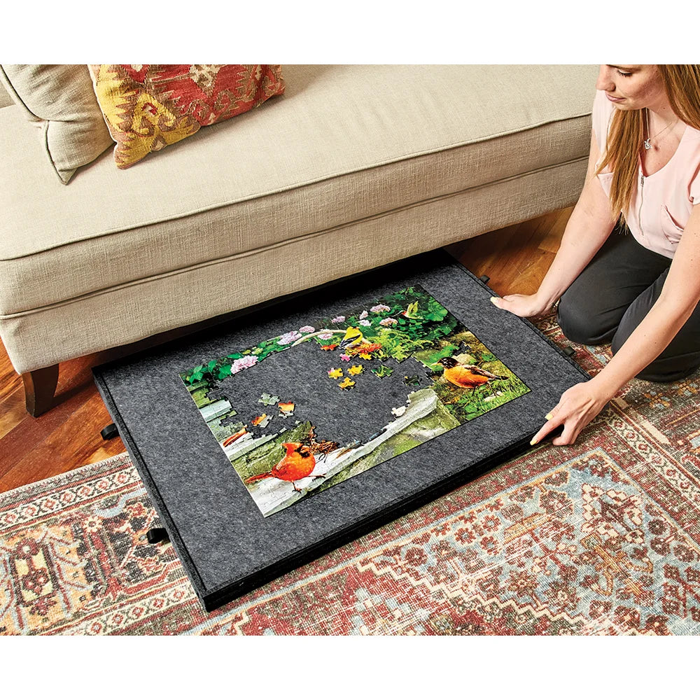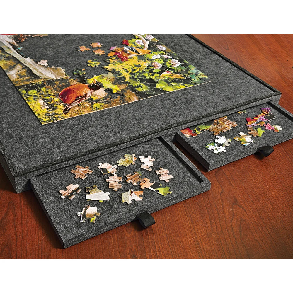 Super lightweight and portable, this new high quality felt storage system is designed for durability and convenience. It’s 3 times lighter than traditional wooden models. Featuring four removable sliding drawers to sort and store your pieces, and raised borders keep pieces securely in place while working or storing. Non-scratch bottom. Built for repeated use, it’s the perfect companion for puzzles in progress.