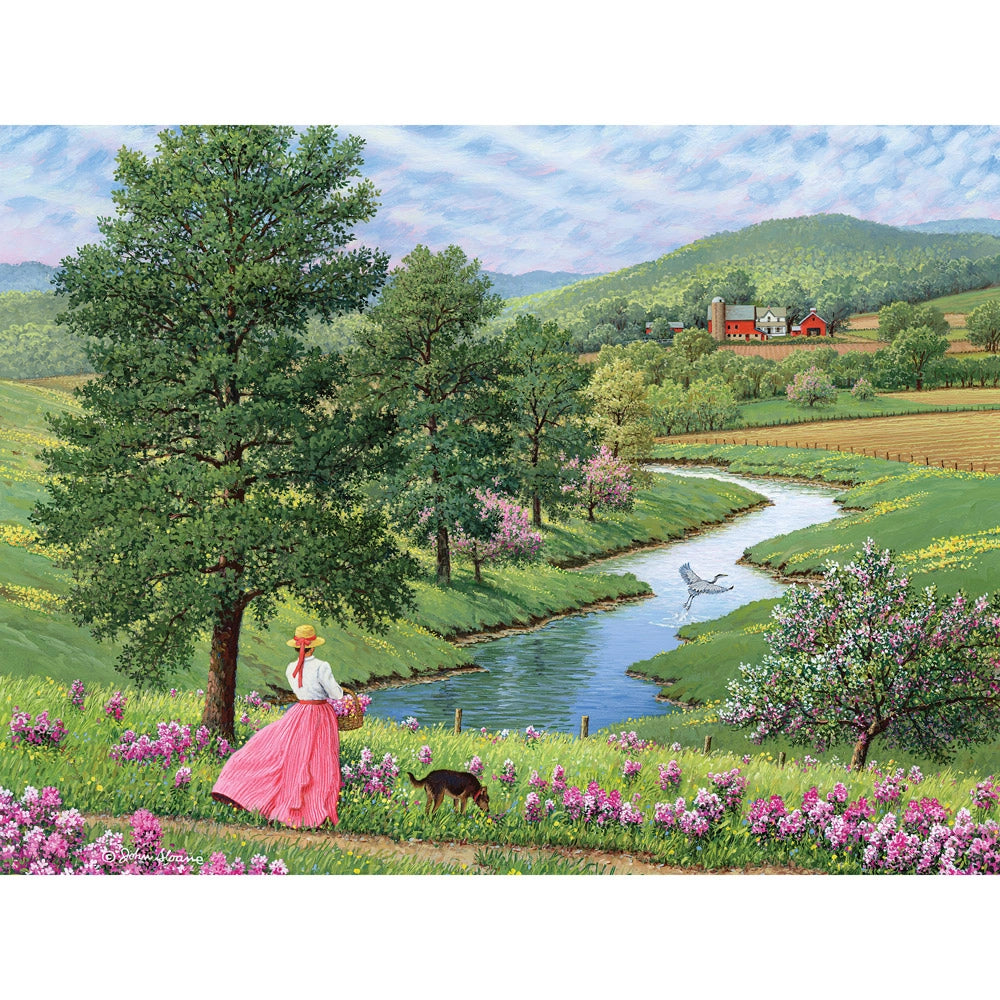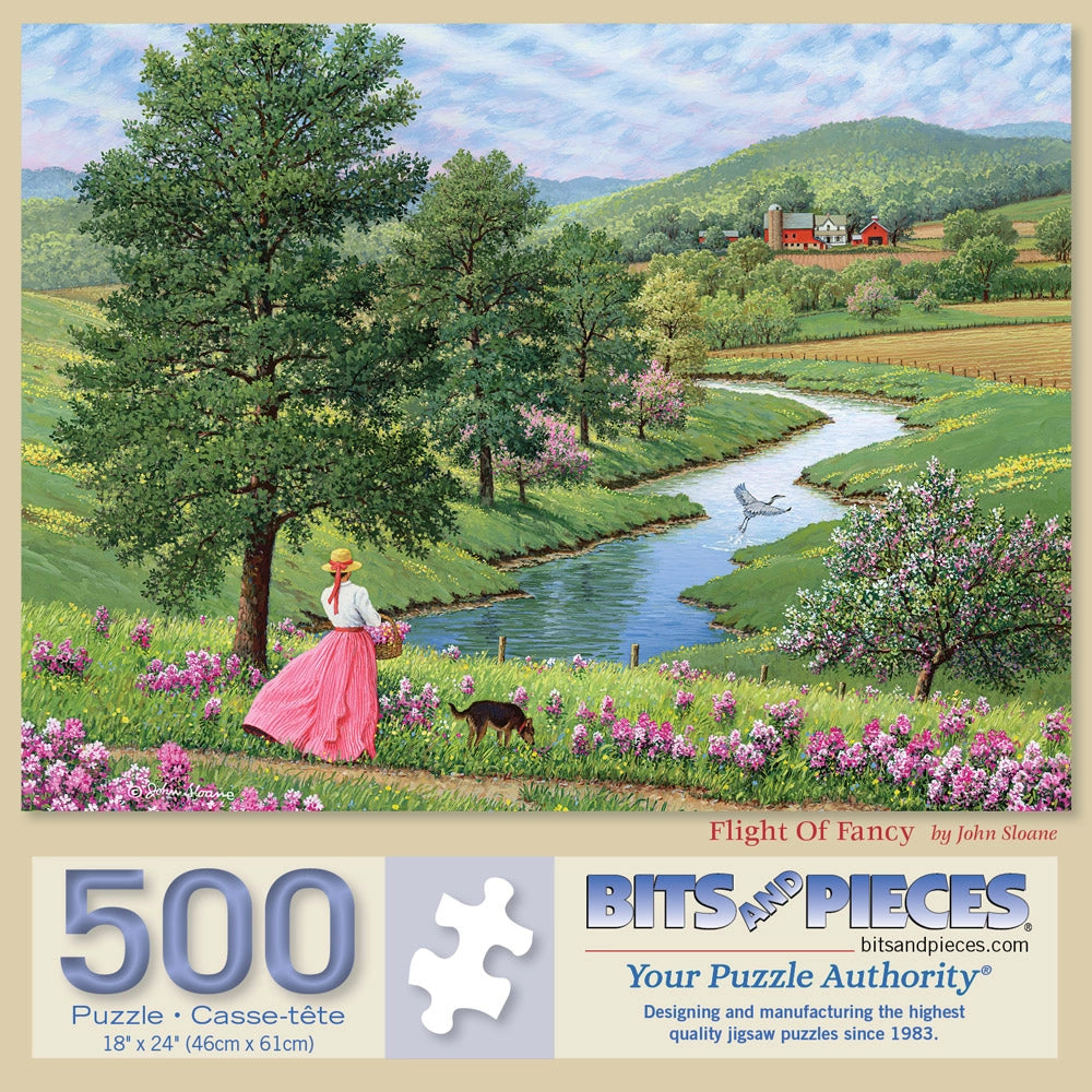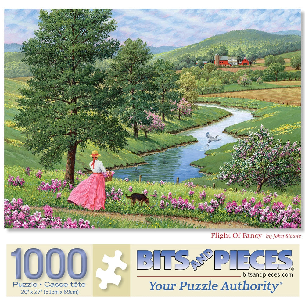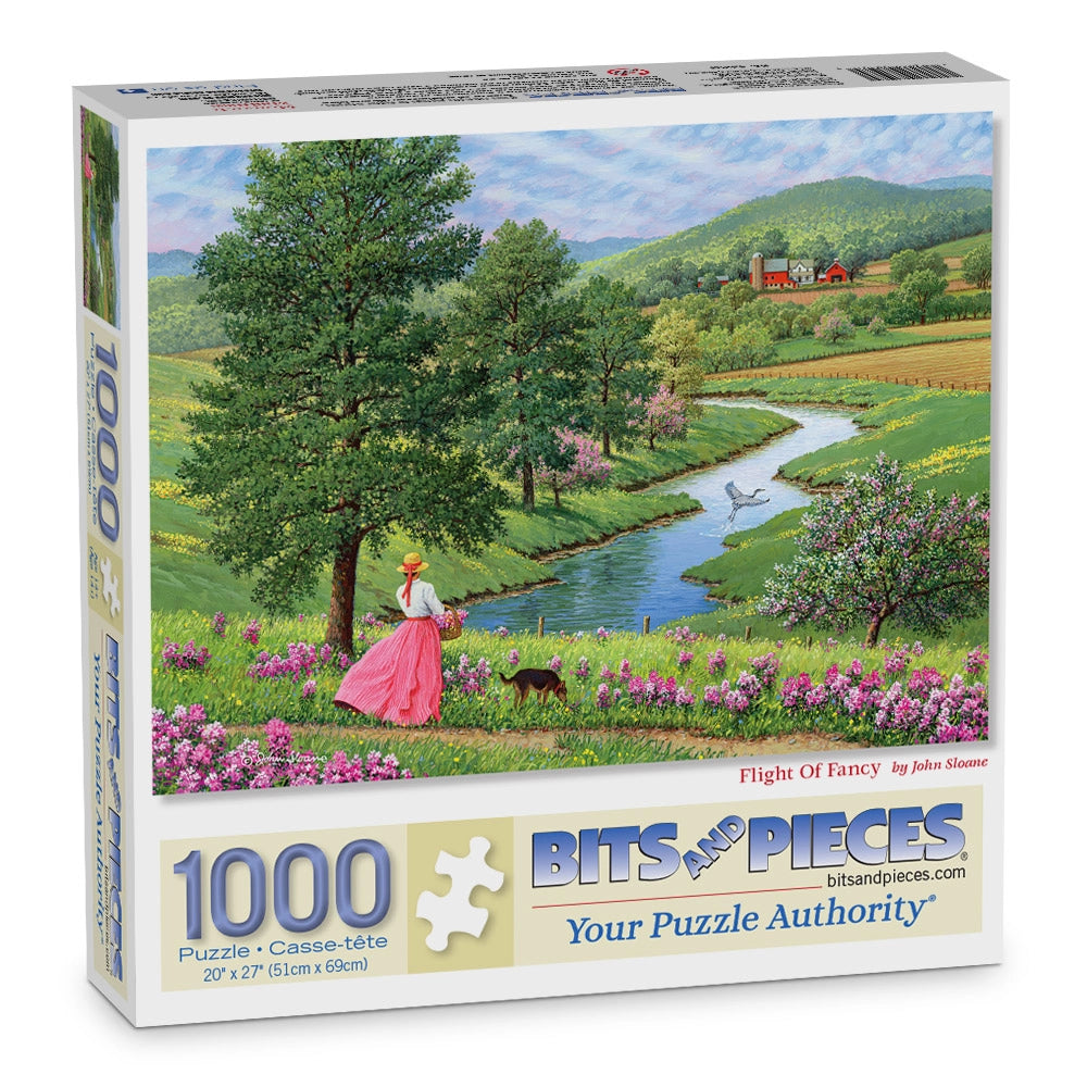 In Flight of Fancy by John Sloane, a young woman strolls beside a winding stream, her bright pink dress popping against fields of green and wildflowers in bloom. A pair of white geese join the peaceful walk in this breezy jigsaw puzzle full of spring color and gentle movement.