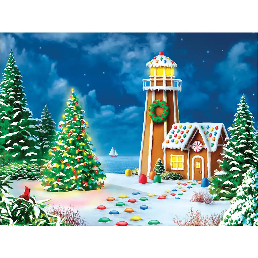 Bring a whimsical winter wonderland to your puzzle table with this festive scene by Alan Giana. Featuring a gingerbread lighthouse, candy-studded cottage, and a glowing Christmas tree under a starlit sky, this sweet and snowy coastal village is full of holiday magic.