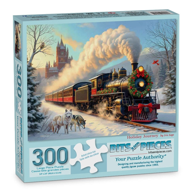 The Holiday Journey puzzle by Iris Sage captures the excitement of a classic Christmas homecoming. A steam engine rolls through a snow-blanketed forest, trailing smoke like a ribbon in the sky. Dogs greet the train, lights glow in the distance, and the wreath-covered engine reminds us that magic is always on time.