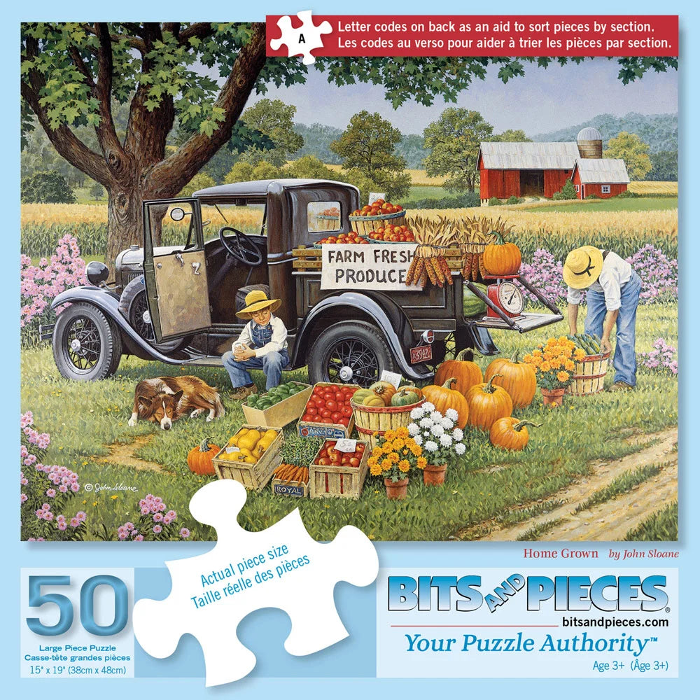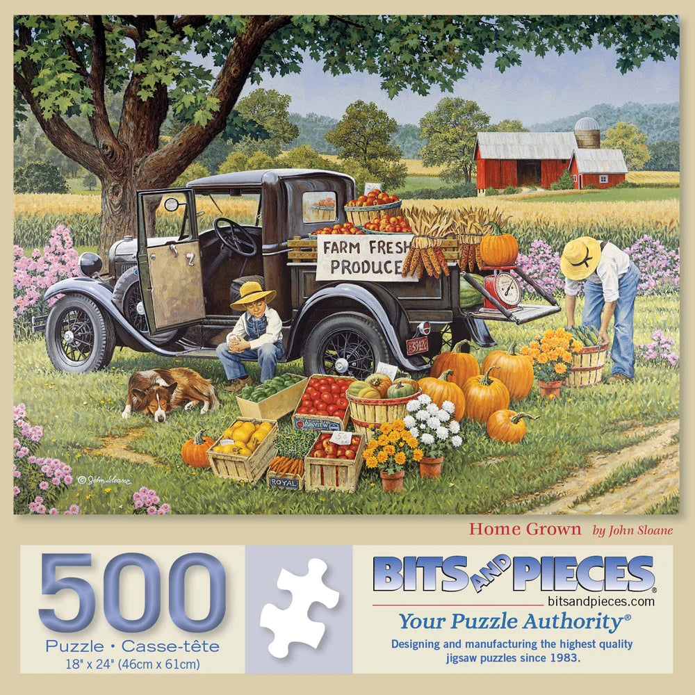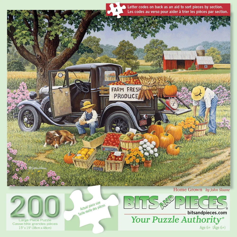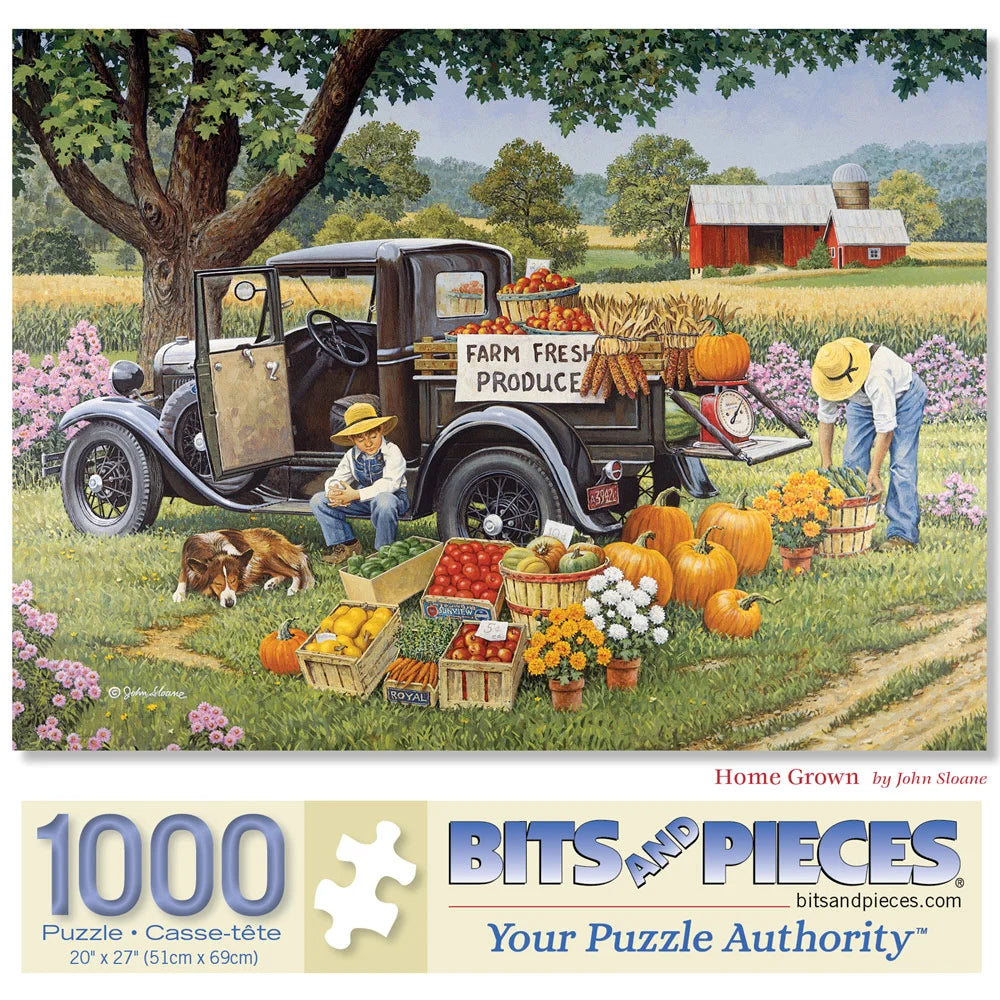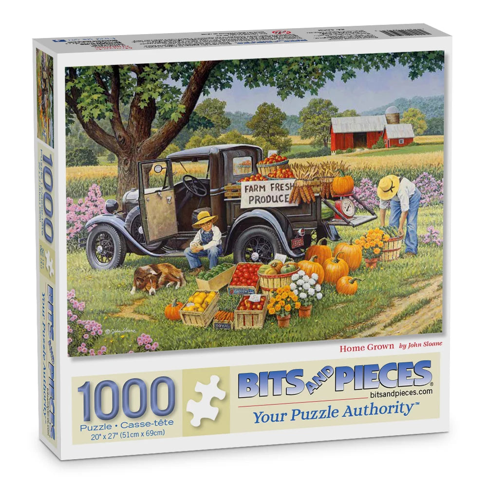 This jigsaw puzzle is designed by John Sloane and available in multiple piece counts. Puzzles are renowned for their engaging complexity, offering a satisfying challenge with their smaller, intricate pieces. Amidst a rustic countryside backdrop, a vintage black truck laden with a bounty of fresh produce, including pumpkins, apples, carrots, and corn, beckons to passersby. By the truck's side, a loyal dog keeps watch while a father unloads the harvest, all against the picturesque backdrop of a proud red barn, evoking a heartwarming and idyllic scene.