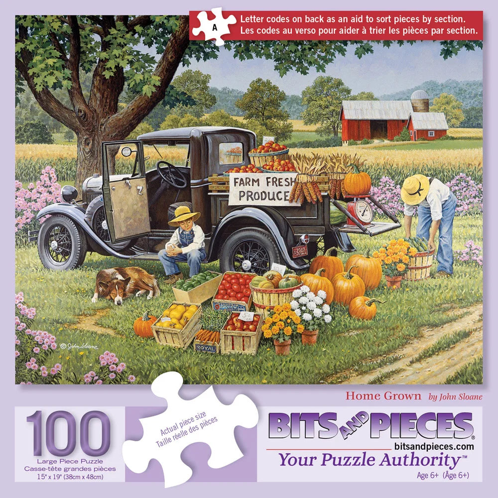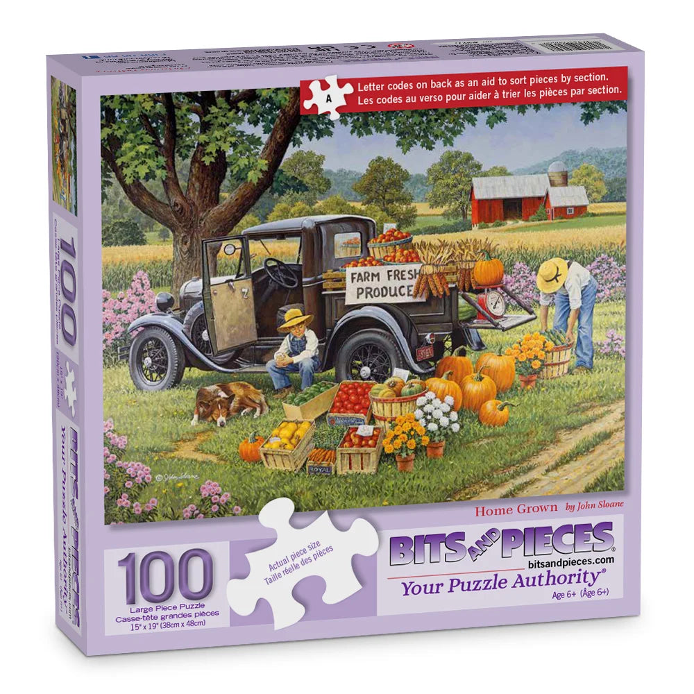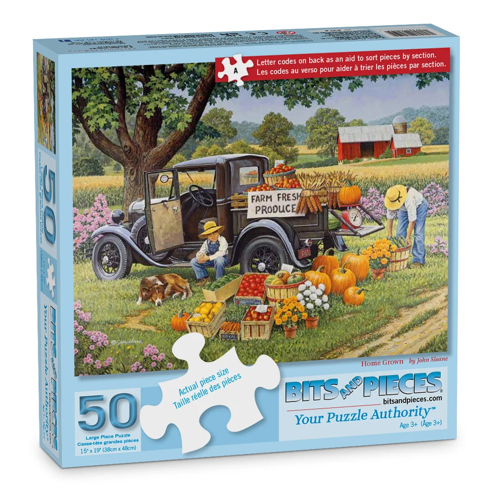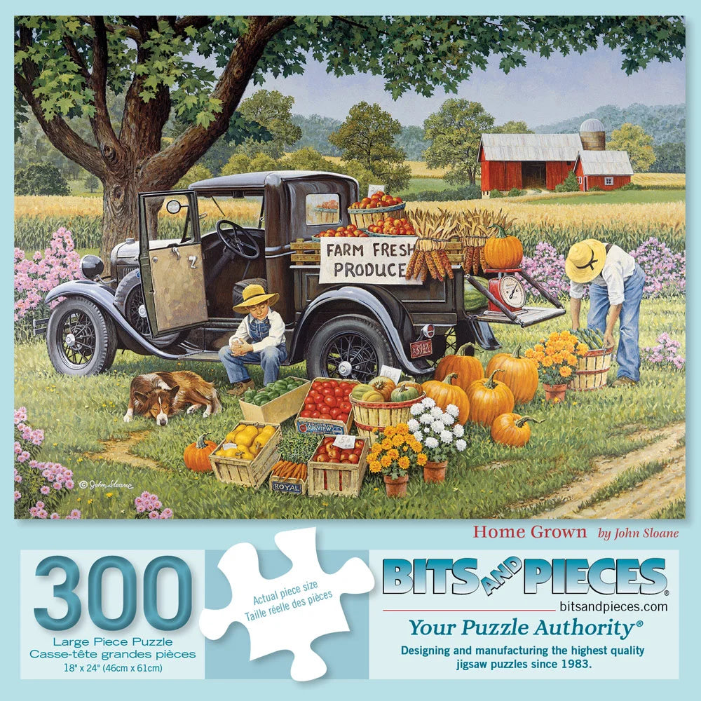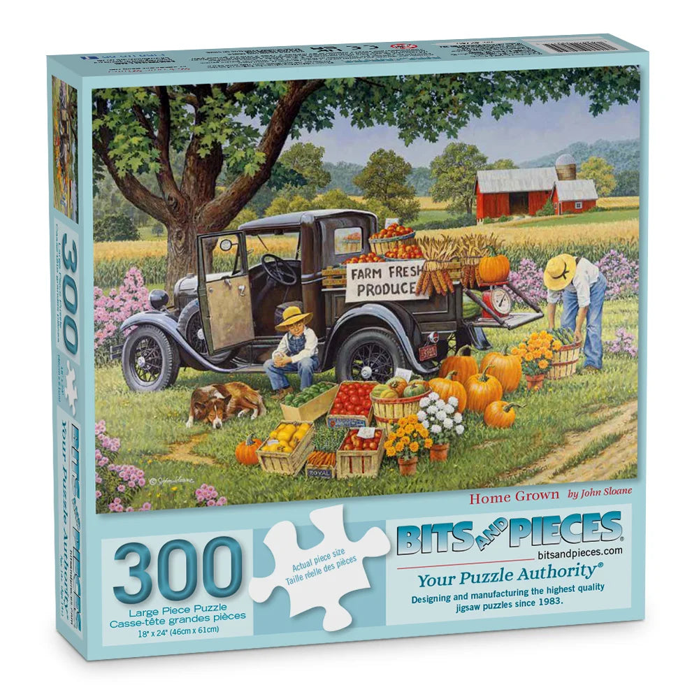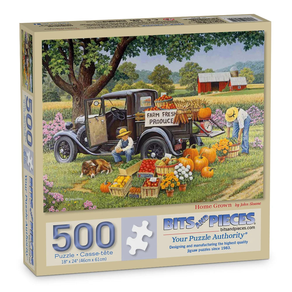This jigsaw puzzle is designed by John Sloane and available in multiple piece counts. Puzzles are renowned for their engaging complexity, offering a satisfying challenge with their smaller, intricate pieces. Amidst a rustic countryside backdrop, a vintage black truck laden with a bounty of fresh produce, including pumpkins, apples, carrots, and corn, beckons to passersby. By the truck's side, a loyal dog keeps watch while a father unloads the harvest, all against the picturesque backdrop of a proud red barn, evoking a heartwarming and idyllic scene.