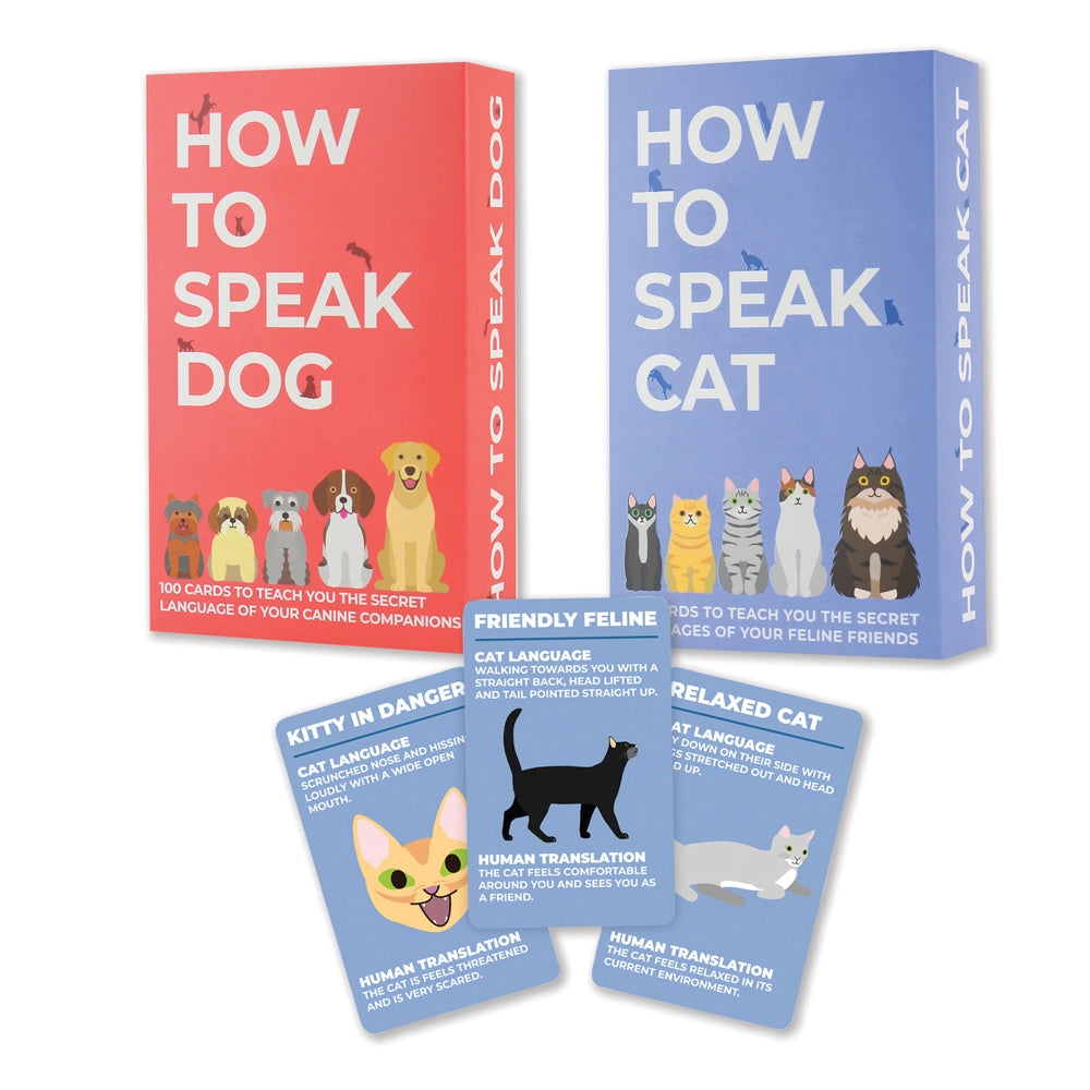 Discover the How to Speak pet communication card sets for cat and dog lovers. Each 100-card deck helps decode body language, sounds, and everyday behaviors so you can better understand your furry friend. Educational, giftable, and fun for pet parents of all kinds.