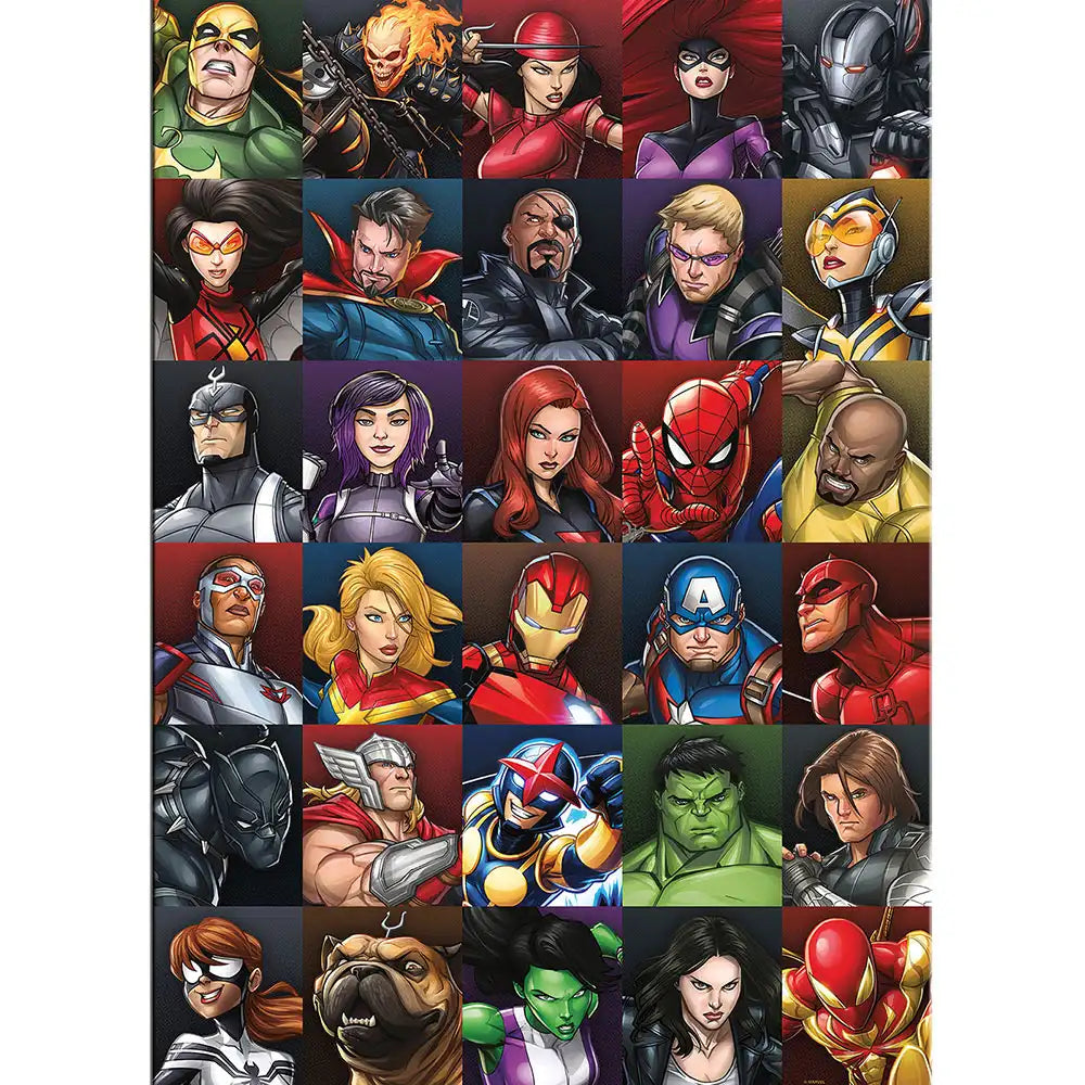 Assemble a powerhouse team of heroes with this dynamic 1000-piece Marvel© jigsaw puzzle. Featuring bold, comic-style portraits of iconic characters like Spider-Man©, Black Widow©, Iron Man©, Hulk©, Captain America©, She-Hulk©, and many more, this puzzle bursts with vibrant energy and fan-favorite faces. Measuring 20" x 28", it's a fun and challenging tribute to the Marvel universe that fans of all ages will love to piece together.