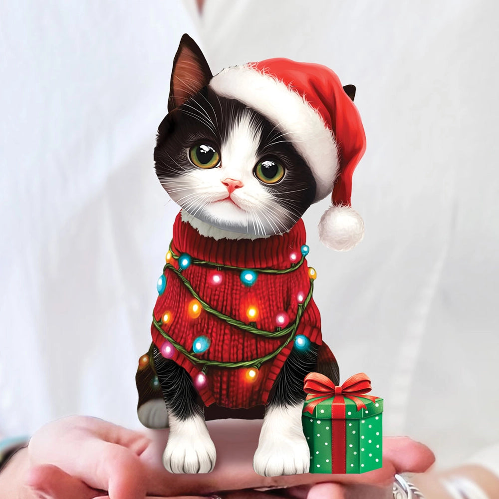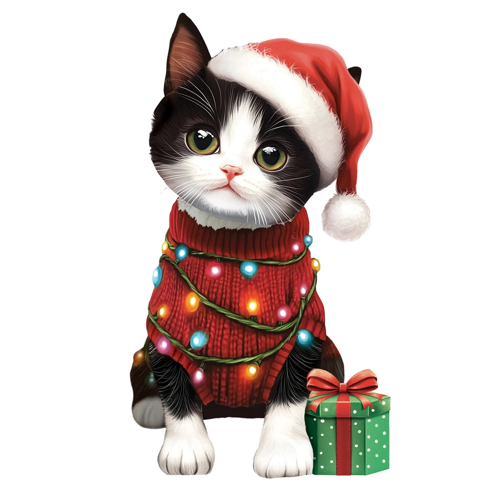 Celebrate the season with a pop-up card full of feline charm! This delightful 3D scene stars an irresistibly festive kitty dressed in a sweater of glowing lights and topped with a Santa hat. The card pops open to approximately 5.25" high by 4.5" across and includes a matching note card for your personal message. A purr-fect way to share holiday magic.