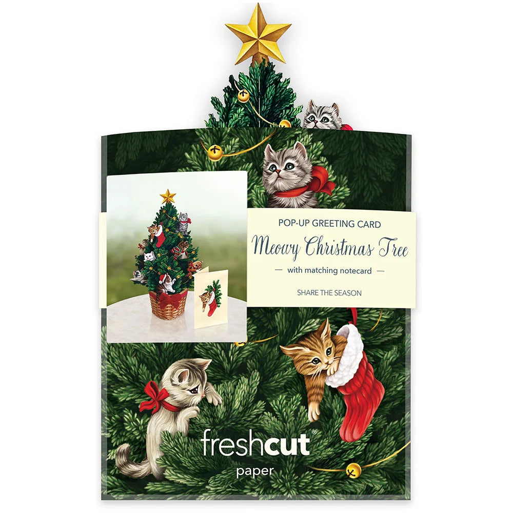 Bring on the holiday cheer—one purr at a time! This pop-up Mini Cat Christmas Tree Card unfolds into a festive fir trimmed with golden bell garland, topped with a star, and overflowing with playful kittens dressed in their holiday best. From Santa hats to striped scarves, each feline adds charm and mischief to this cozy scene, nestled in a woven basket with a bright red bow. Includes a coordinating notecard featuring one of the mischievous meowers, ready for your message of the season. Folds flat for mailing. Measures 7-1/2" x 5" when open.