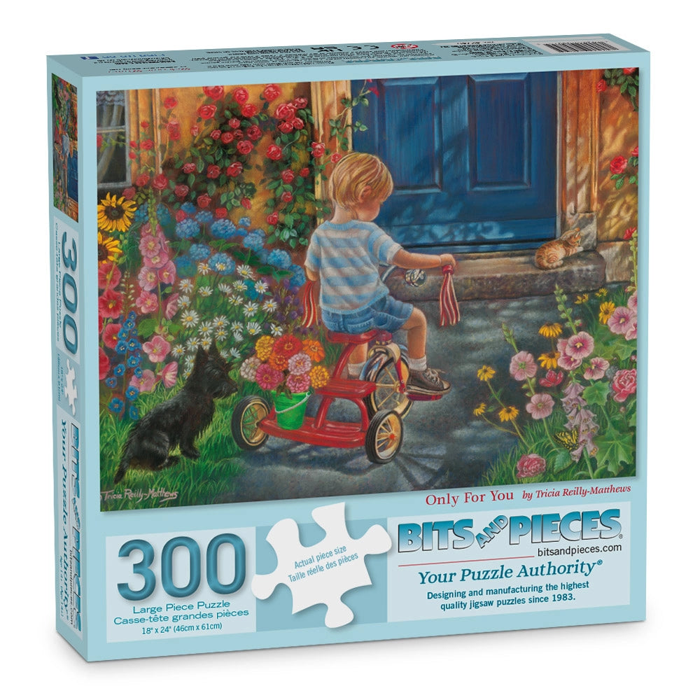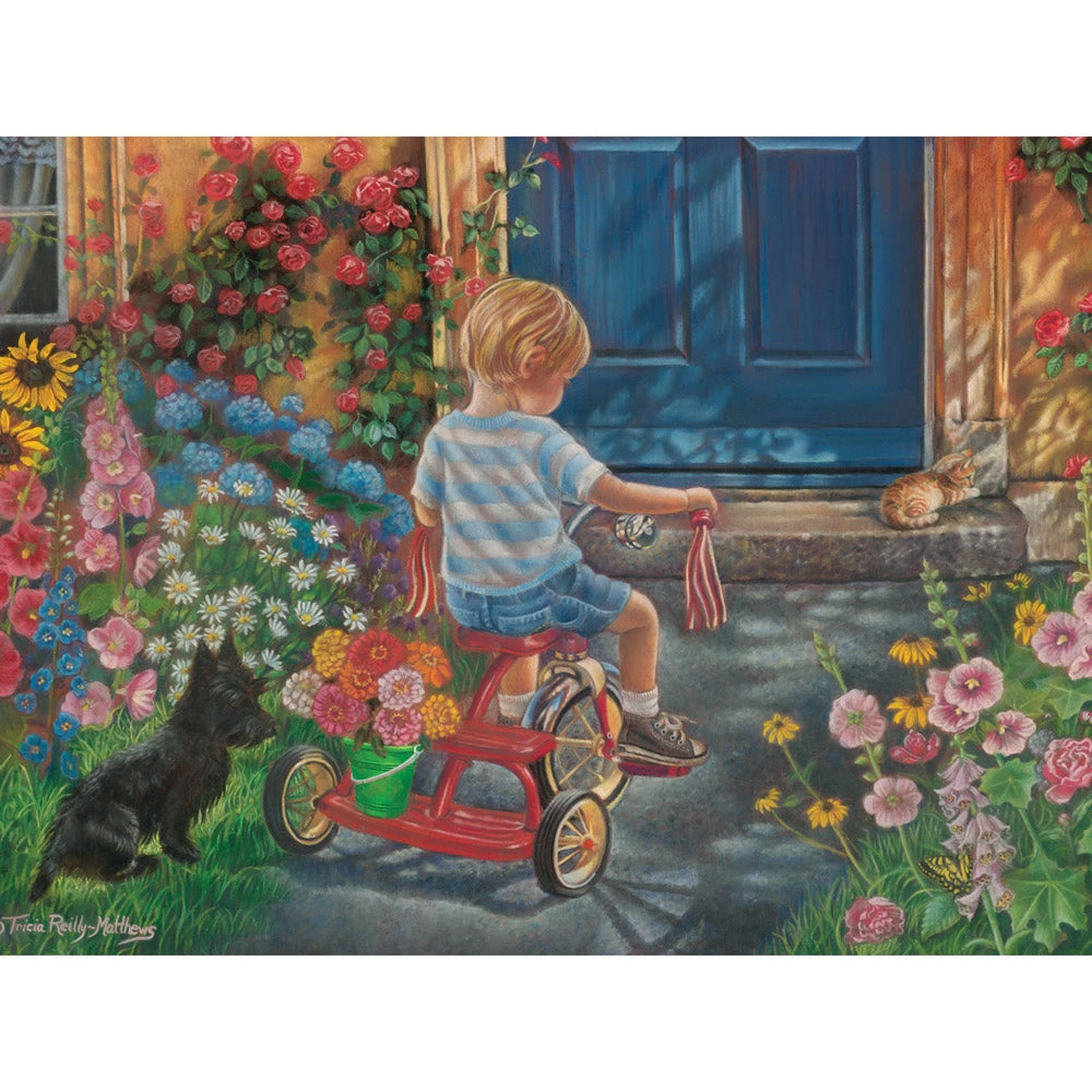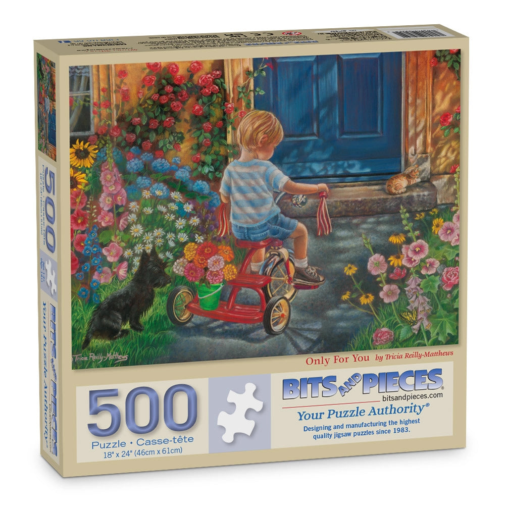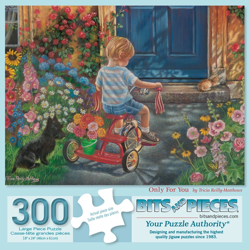 In Only for You by Tricia Reilly-Matthews, a young girl gently offers a potted flower to her furry companion as they sit together on a red tricycle. The scene is full of playful innocence and blooming color, making this jigsaw puzzle a joyful reminder of youthful generosity and quiet friendship.