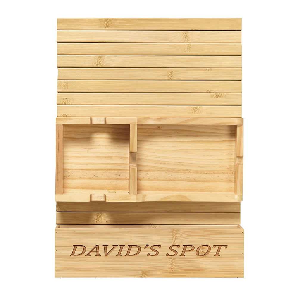 Claim your favorite seat in style with this personalized bamboo couch caddy. It keeps your go-to items like remotes, snacks, and drinks right where you need them, within arm’s reach. Crafted from smooth, durable bamboo, it fits securely over most sofa or chair arms and features a handy pocket for magazines, tablets, or anything you need during downtime. Add any name or phrase up to 20 characters exactly as you’d like it to appear, such as “David’s Spot.” The word “Spot” is only included if you add it. With a classic design and anti-slip backing, it’s a thoughtful and practical touch for any cozy corner.
