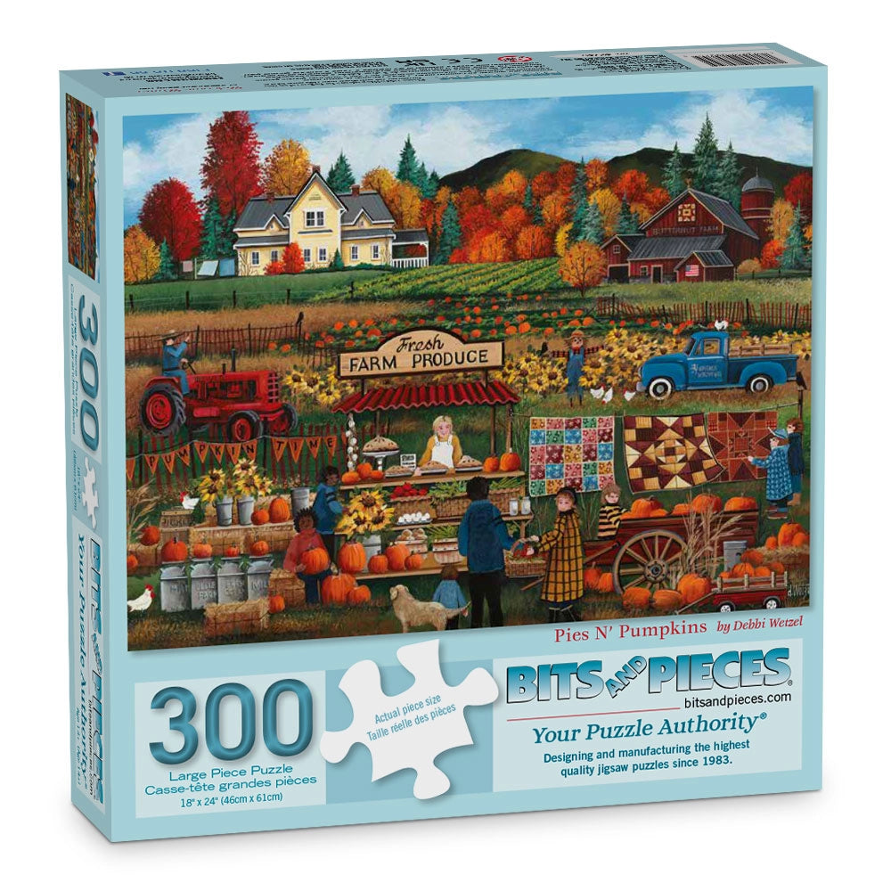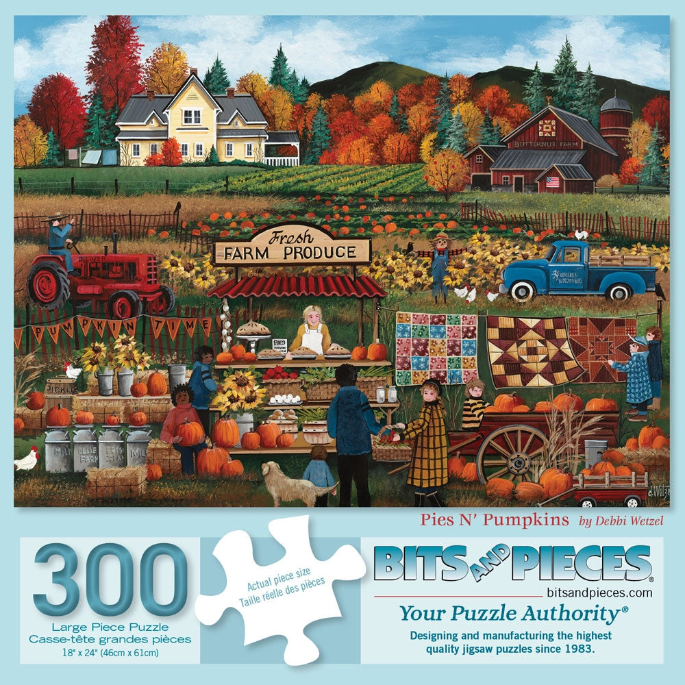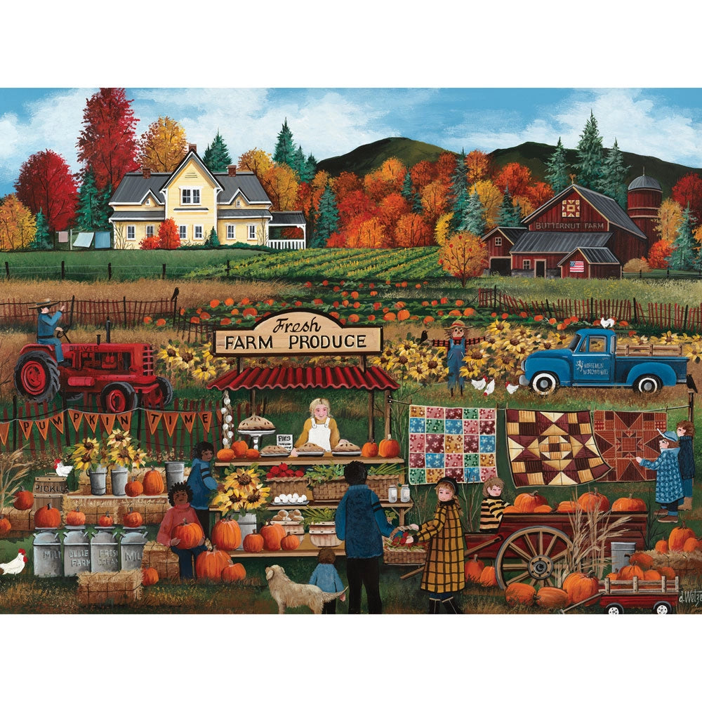 Celebrate the sights and flavors of fall in this bustling autumn puzzle by Debbie Wetzel. Stalls are loaded with pumpkins, pies, apples, and cider, while vibrant leaves color the landscape. A perfect seasonal puzzle to welcome cooler days and harvest fun.