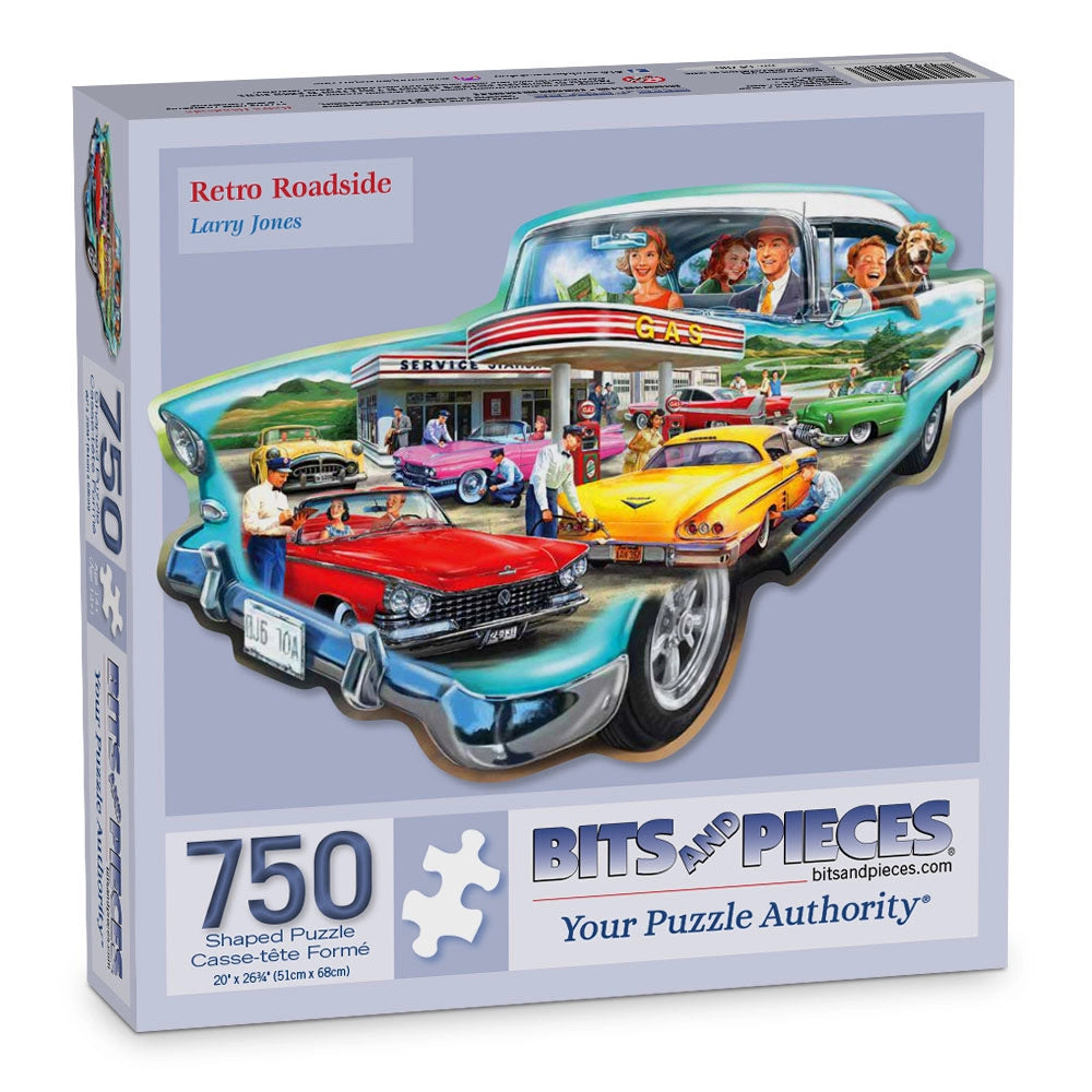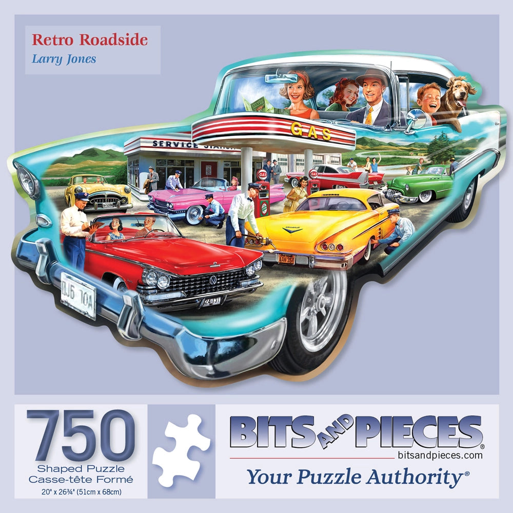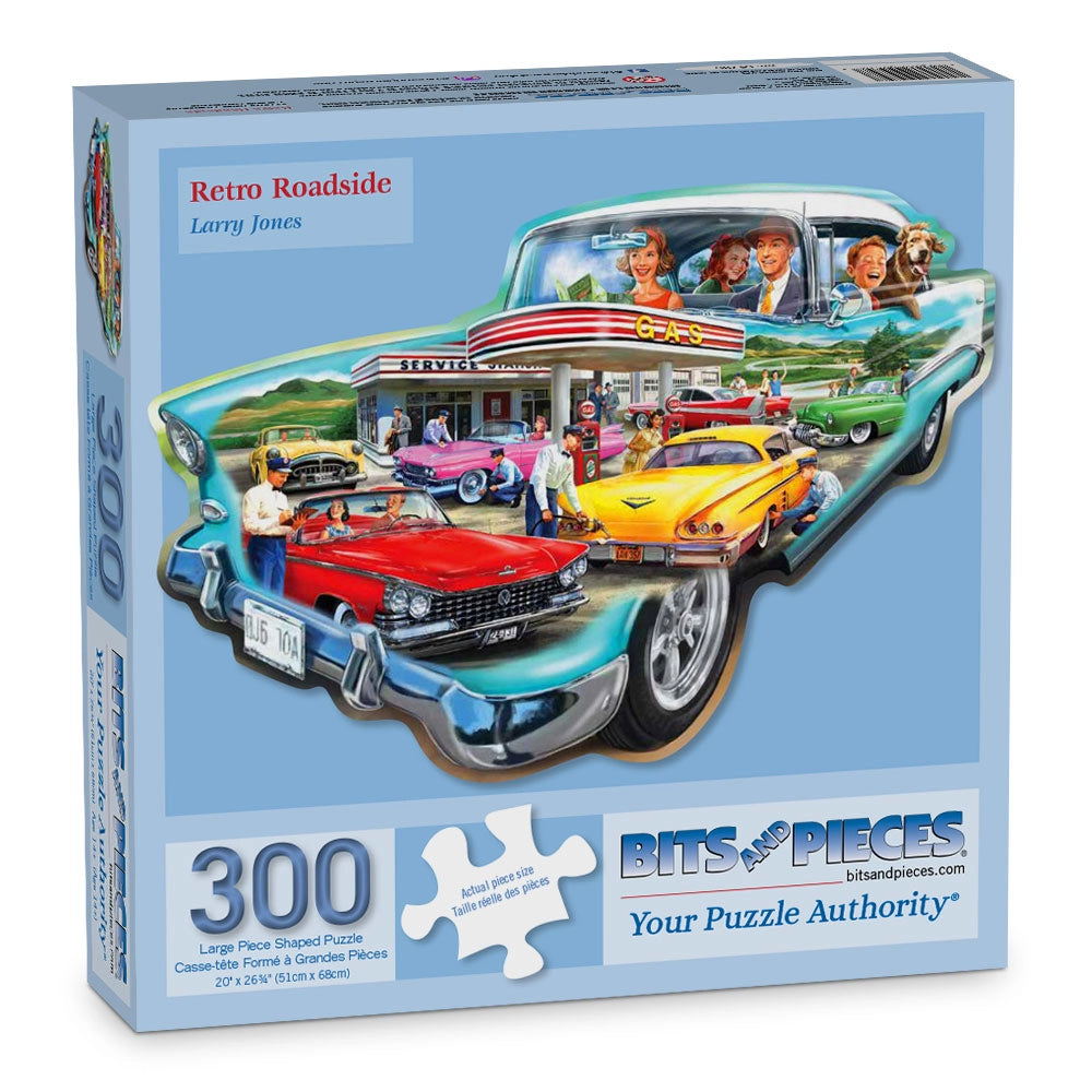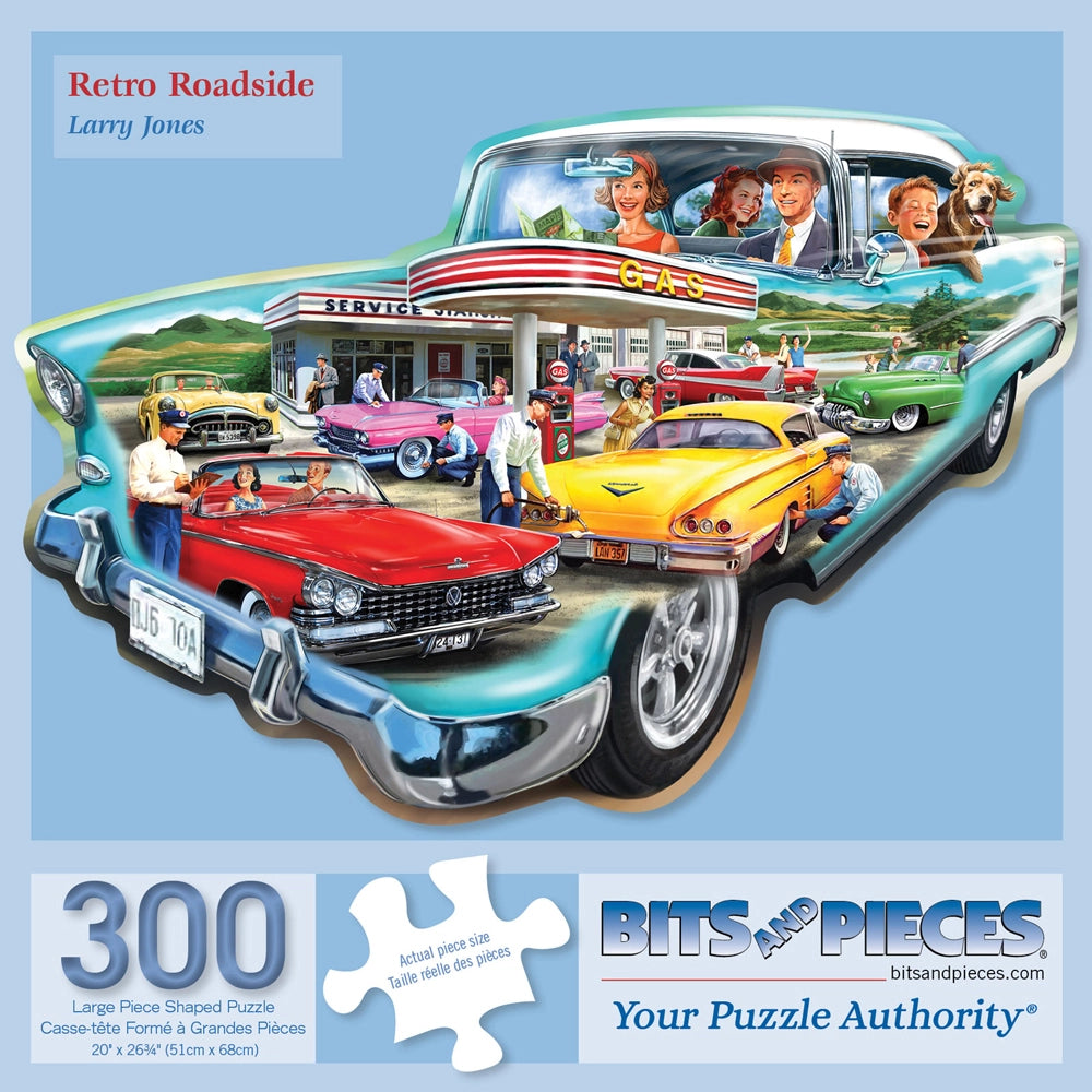 Rev up your puzzle time with the Retro Roadside Shaped Puzzle, a blast from the '50s packed into a bold car-shaped design. From shiny hot rods to classic convertibles, this puzzle brings a vintage gas station to life with chrome, color, and good old-fashioned fun. Sock-hop style, smiling service attendants, and poodle skirts included- no road trip required. Available in two piece counts, Made with recycled materials.
