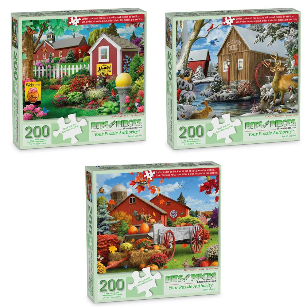 The Alan Giana Seasons on the Farm Collection captures the charm of country life through spring, fall, and winter. Birds and the B’s bursts with colorful blooms, buzzing bees, and a sunny farmyard welcome. Harvest Harmony celebrates autumn’s bounty with pumpkins, hay bales, and golden leaves drifting past red barns. Winter Wilderness transforms the landscape into a peaceful snowy wonderland, complete with wildlife and a rustic mill. Alan Giana’s vibrant colors and inviting details make this collection perfect for seasonal puzzle lovers and fans of nostalgic rural beauty.