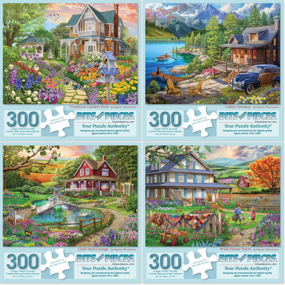 This Value Set is designed by Bigelow Illustrations and includes:- Victorian Garden Path Jigsaw Puzzle- Cabin Getaway Jigsaw Puzzle- Wild Flower Farm Jigsaw Puzzle- Little Red Cottage Jigsaw Puzzle