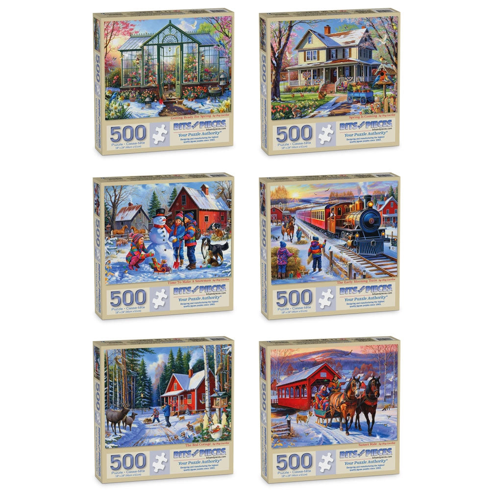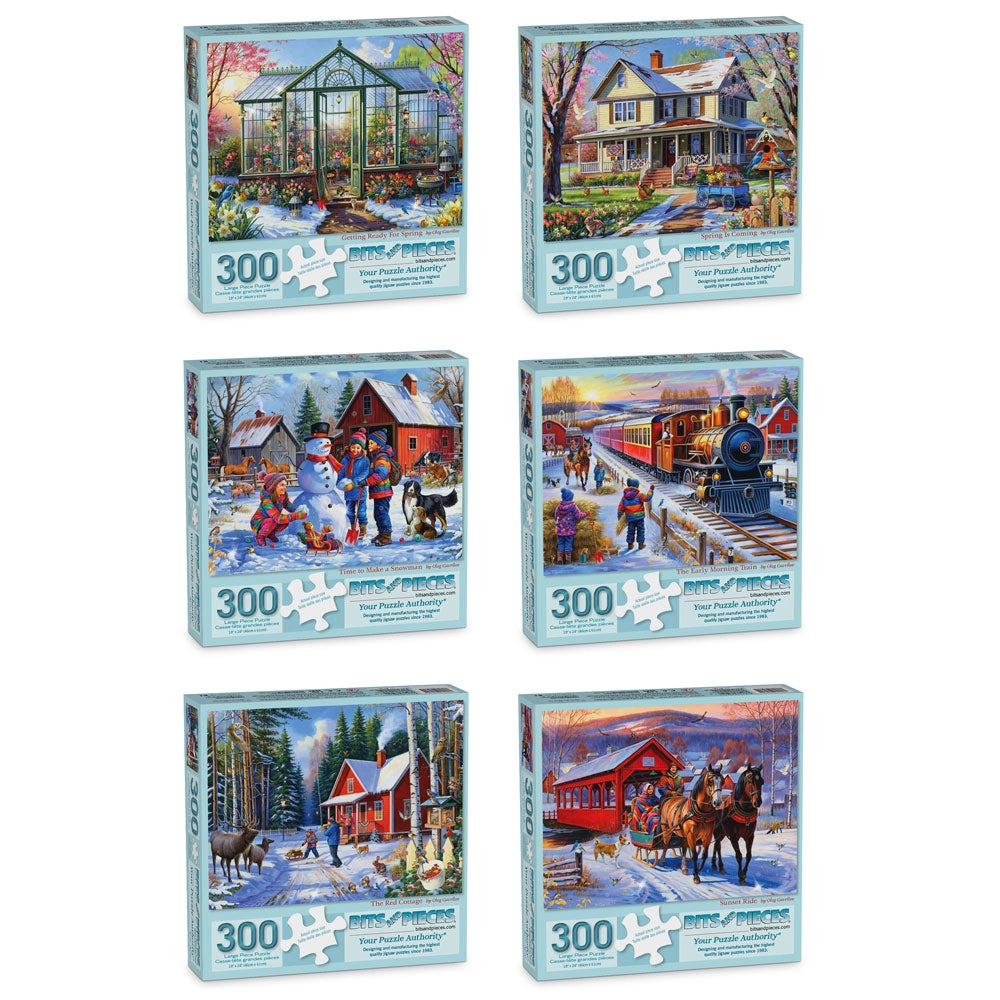 Celebrate the beauty of the season with this collection of six winter and early spring jigsaw puzzles by artist Oleg Gavrilov. Each puzzle features a cozy, nostalgic scene filled with warmth, color, and heart—from snowmen and sleigh rides to blooming greenhouses and front porch puddles. A perfect gift for any puzzle fan who loves rural charm and seasonal magic.