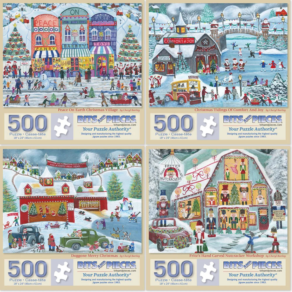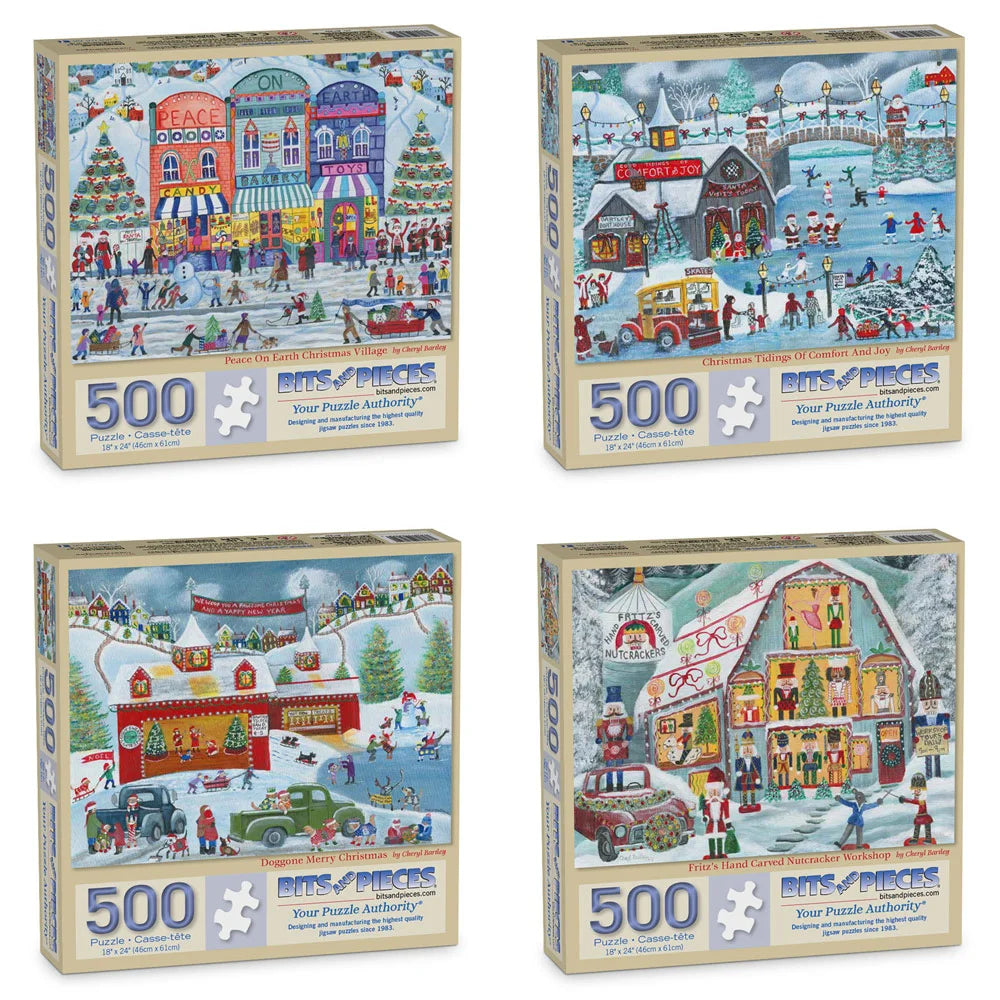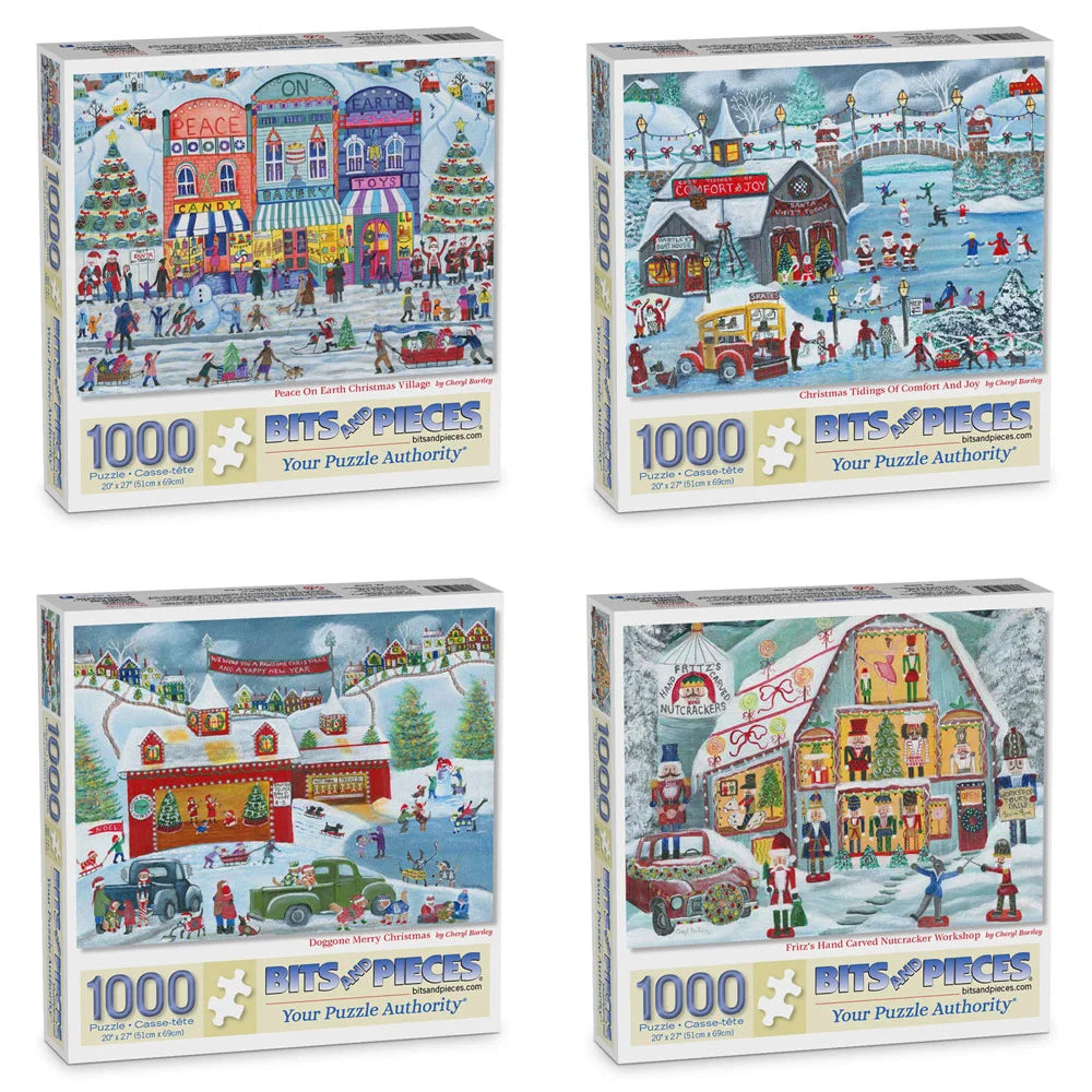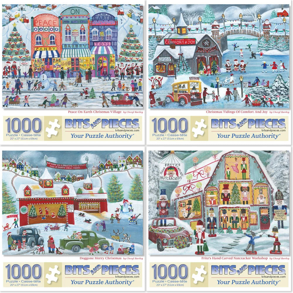 Celebrate the season with Cheryl Bartley’s charming holiday village scenes, bursting with nostalgic cheer. From ice skating and Christmas markets to nutcracker workshops and vintage trucks hauling trees, each puzzle captures a heartwarming slice of small-town holiday magic. With cheerful colors and delightful details, these puzzles are a joyful way to ring in the season.
