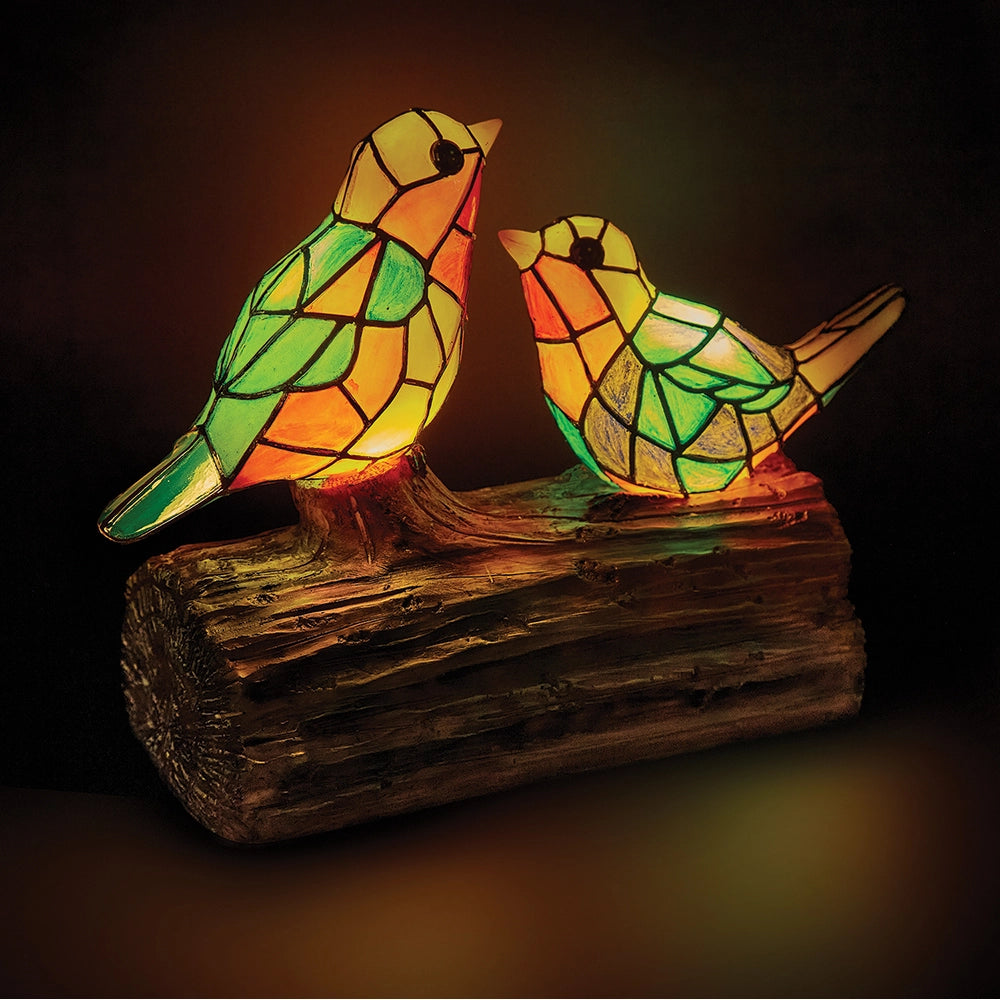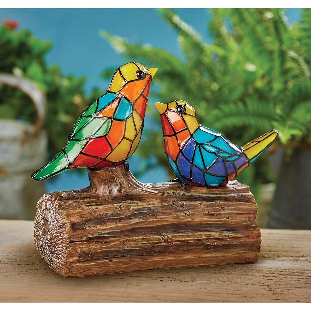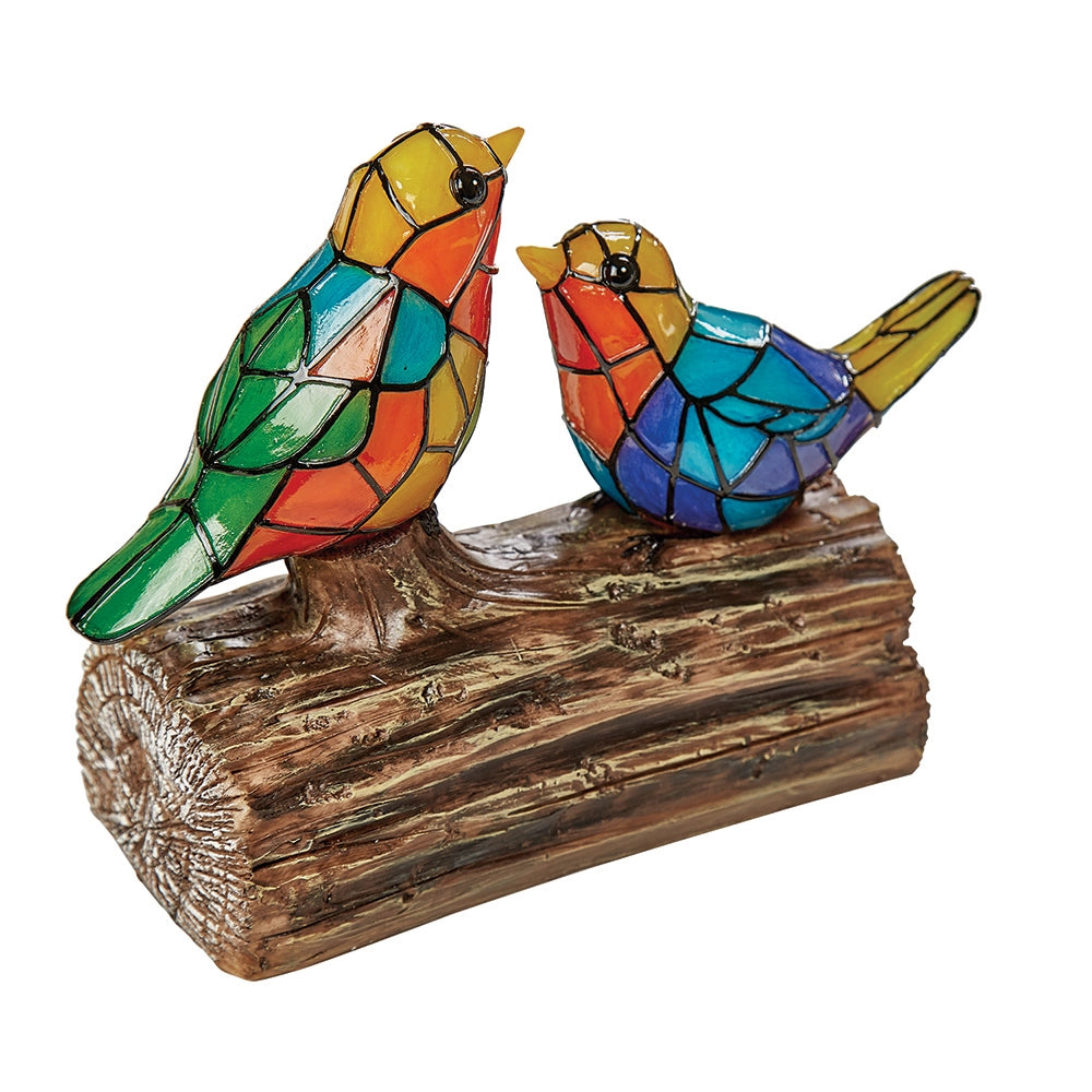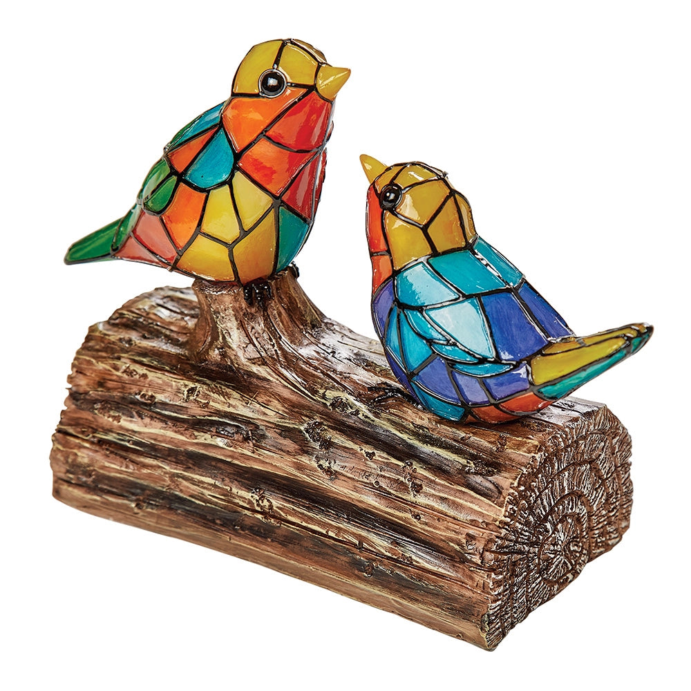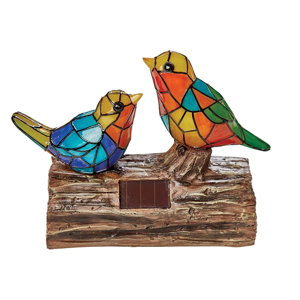 Bring a touch of stained glass beauty to your garden with these radiant Solar Birds. Perched sweetly on a log, each bird glows from within at night, casting a warm and colorful light through their mosaic-style wings. Made from durable, weather-resistant resin, this charming pair is powered by a hidden solar panel and adds year-round magic to any outdoor space. Requires 1 AAA battery (included). Measures 9 inches high by 7 inches wide.