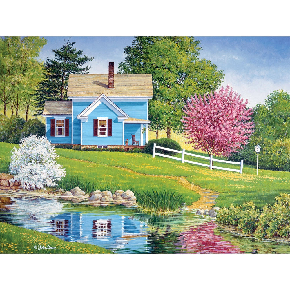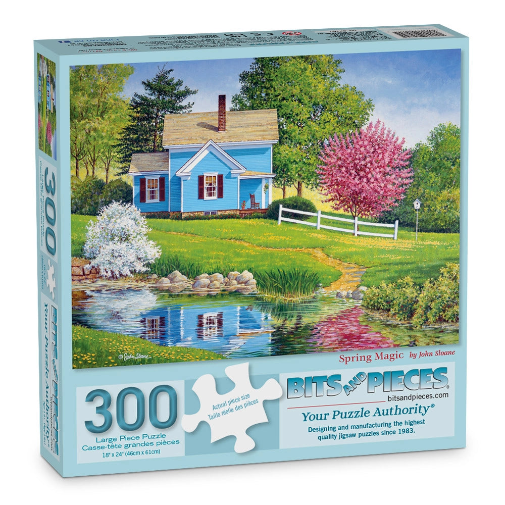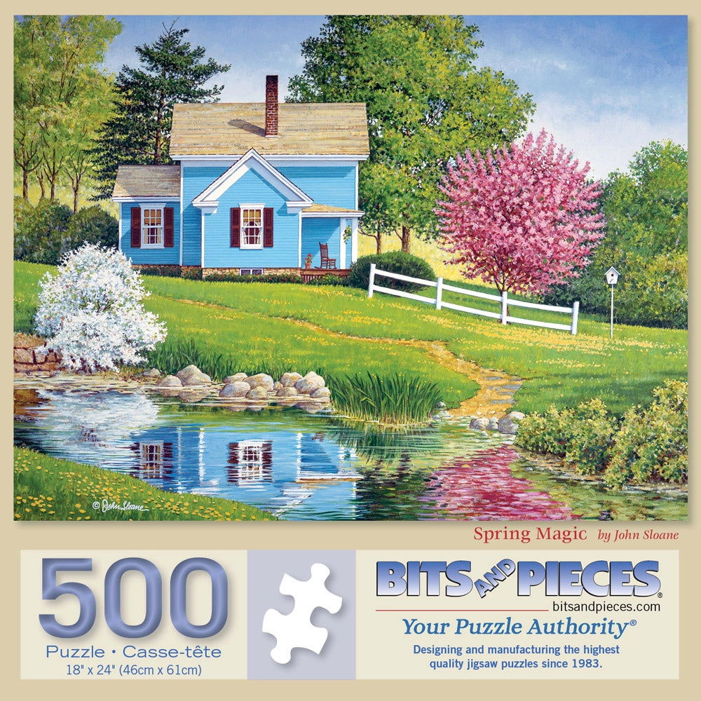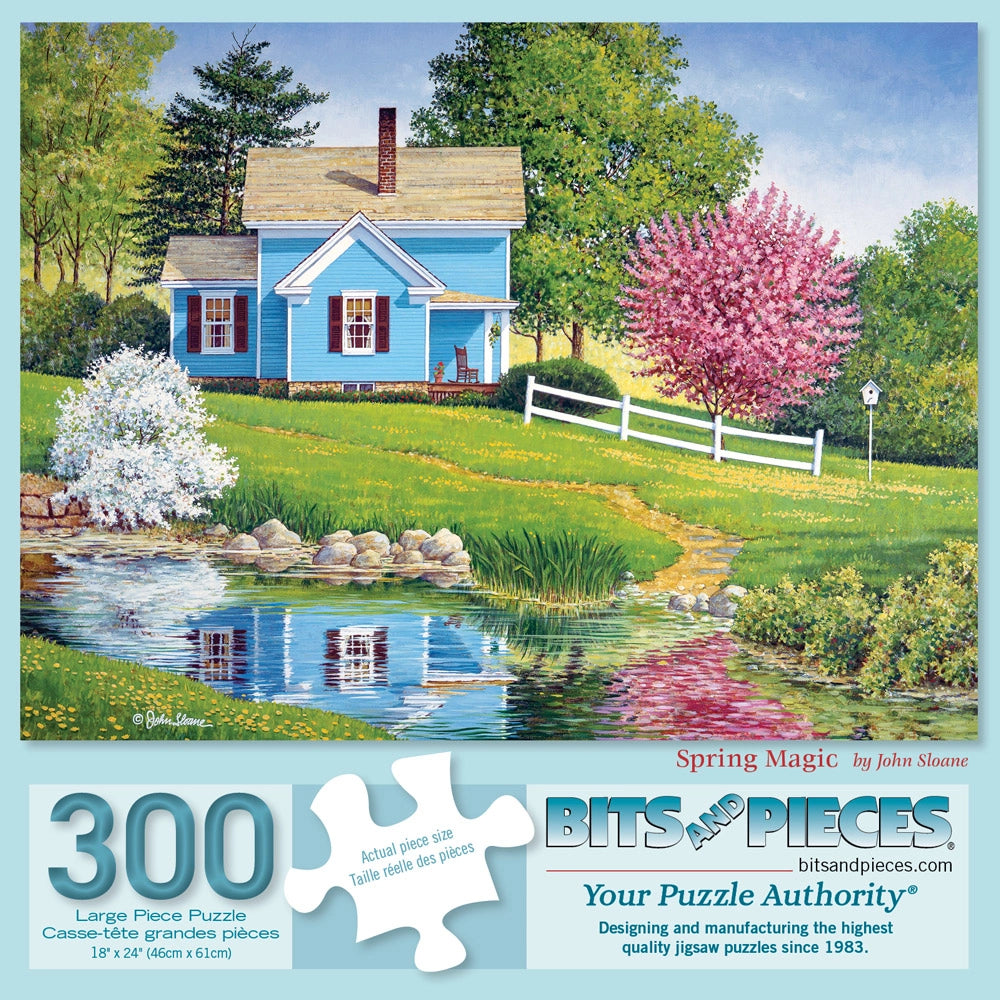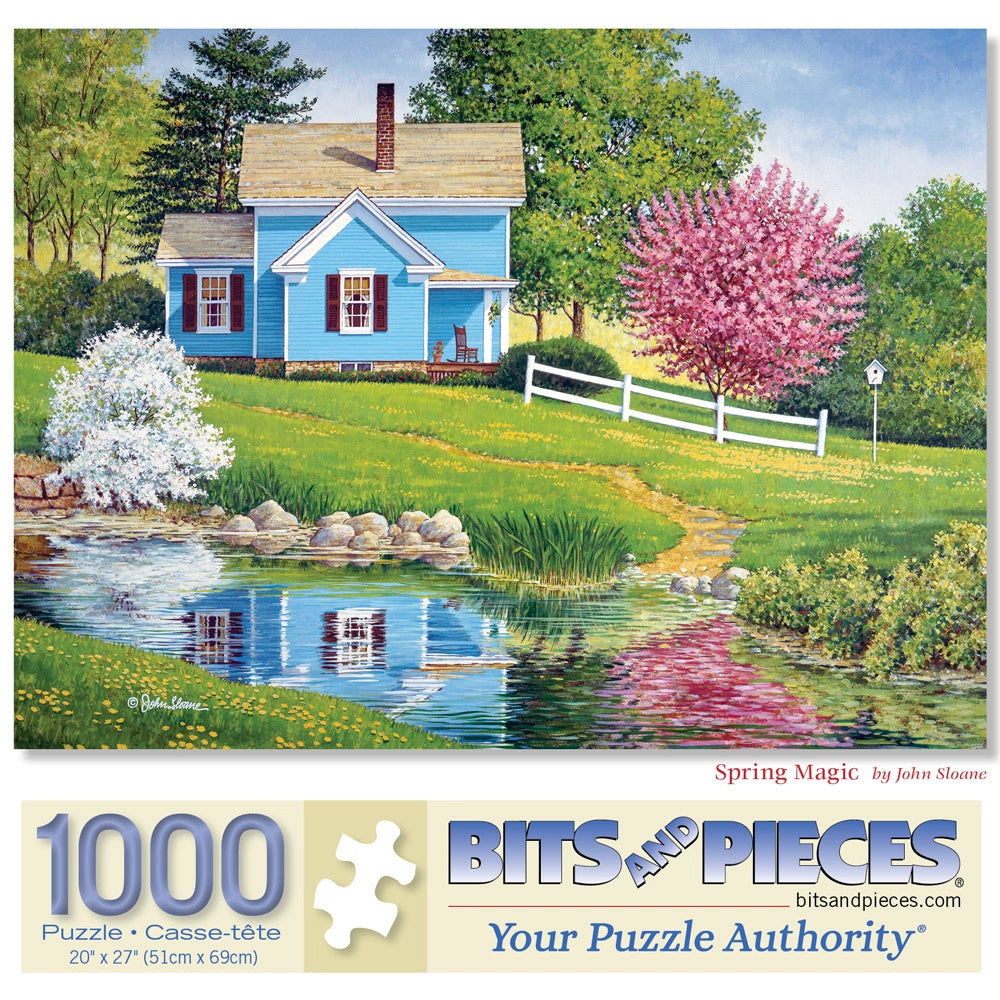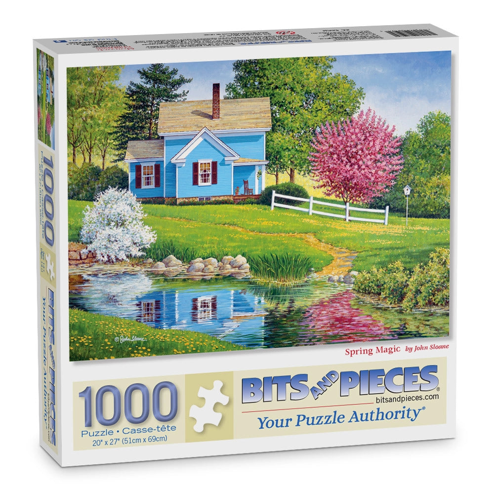 Spring Magic by John Sloane is all about new beginnings. A cozy cottage is surrounded by trees in bloom, tulips bursting from garden beds, and calm water reflecting a perfect sky. Every piece is packed with soft colors and hopeful energy, making this a joyful puzzle from start to finish.