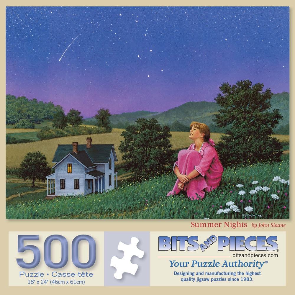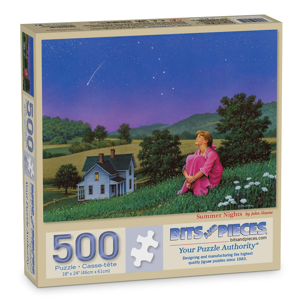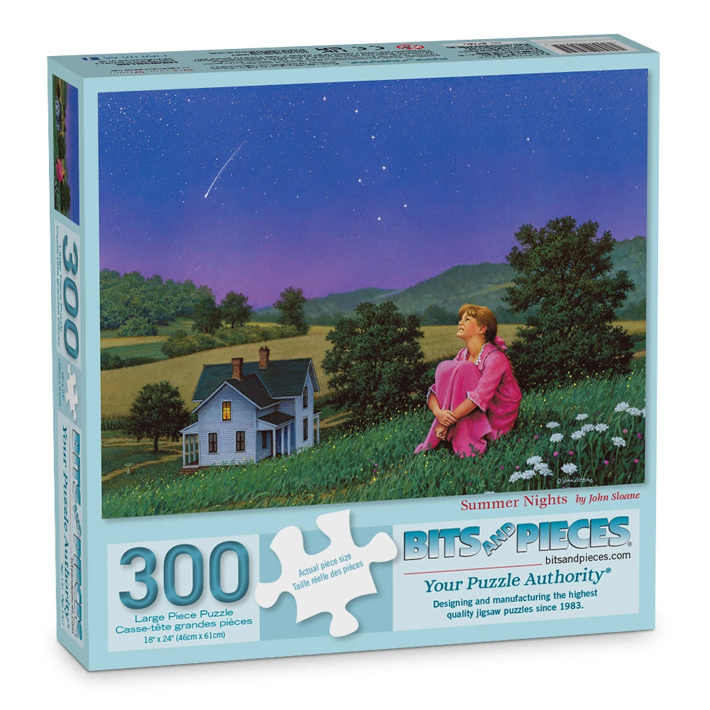 A quiet evening turns magical in Summer Nights by John Sloane. As stars rise over a cozy country home, a woman in pink sits among blooming clover, gazing into the twilight sky. Soft colors and subtle gradients add a soothing challenge to this peaceful jigsaw puzzle.