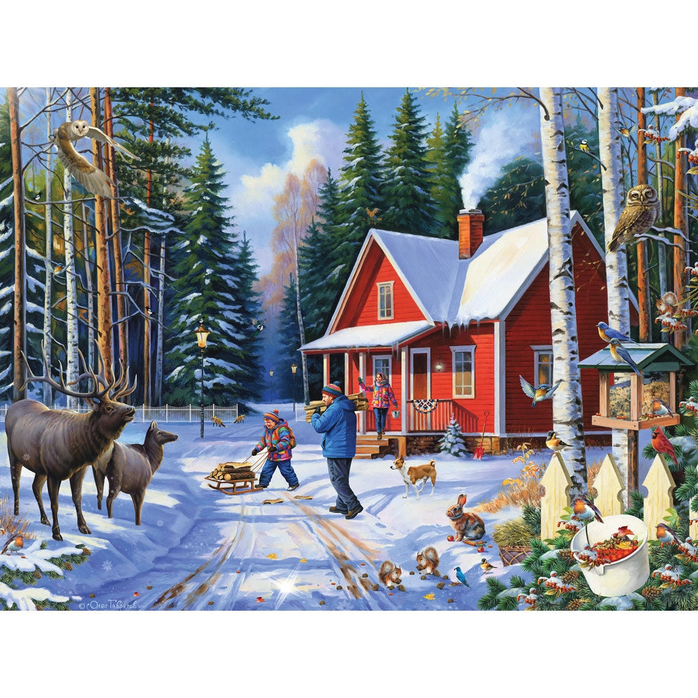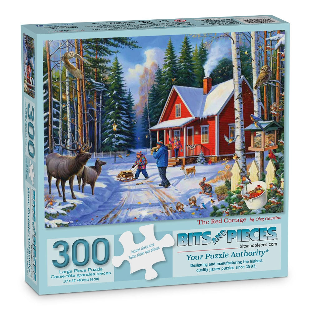 This peaceful winter puzzle shows a red cottage nestled among pine trees, with deer quietly watching children play in the snow. Soft shadows, warm windows, and the hush of the forest make this scene feel like a holiday card brought to life. A beautiful jigsaw puzzle that celebrates quiet moments outdoors.