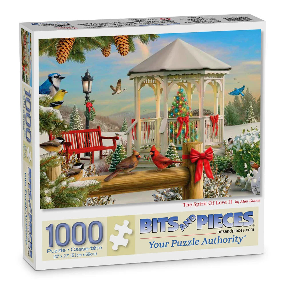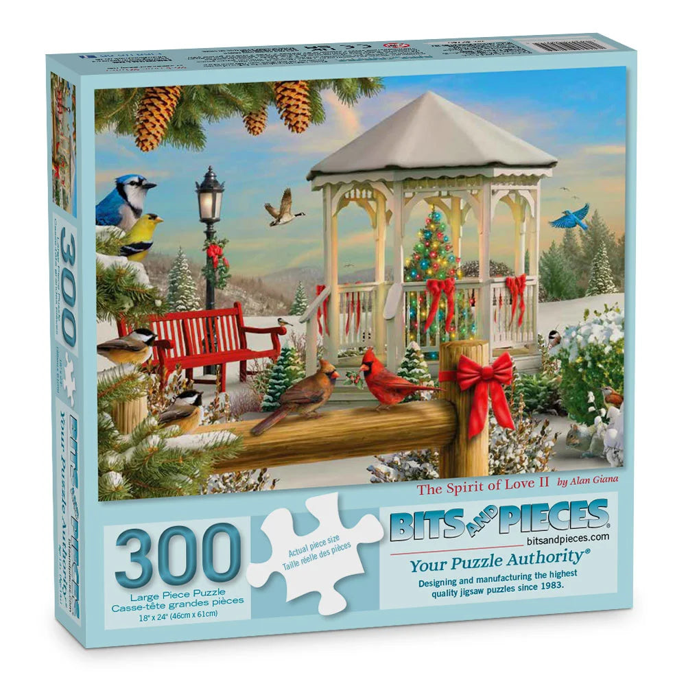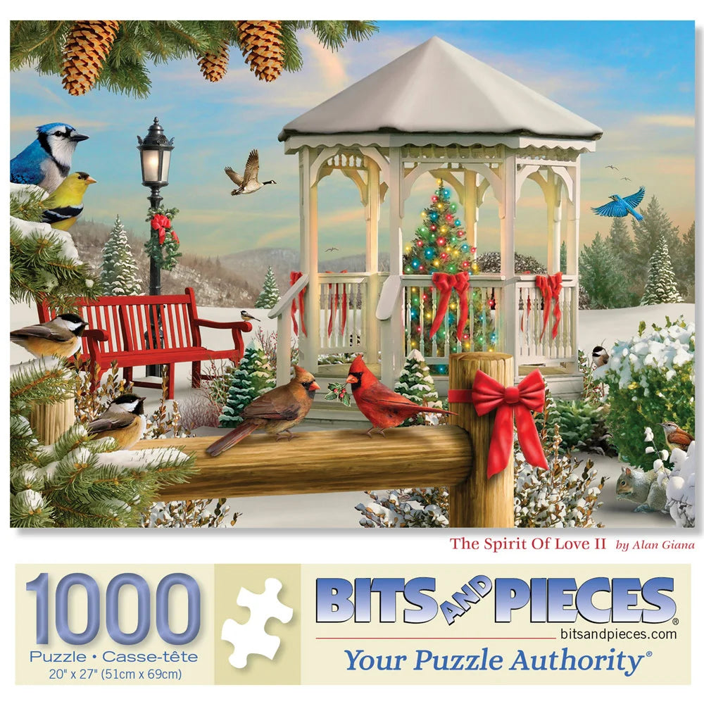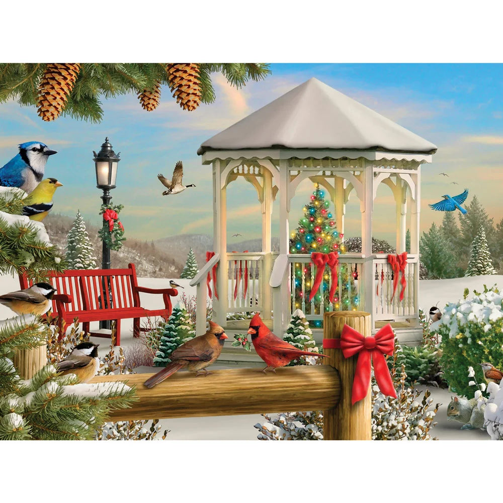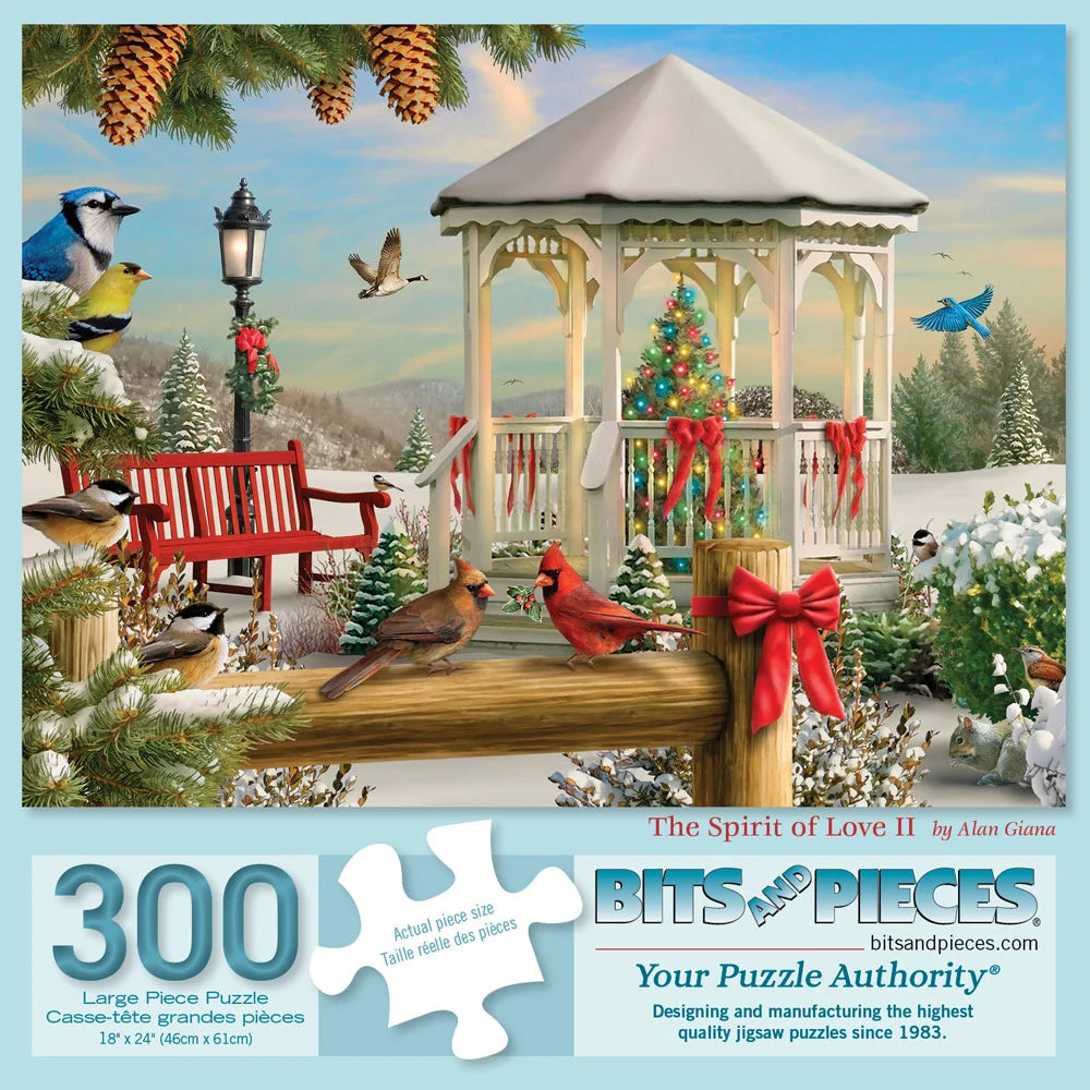 A snow-dusted gazebo adorned with ribbons and a glowing Christmas tree sits at the heart of The Spirit of Love II by Alan Giana. Surrounded by bright cardinals, cozy benches, and woodland peace, this tranquil scene is a celebration of beauty, nature, and the quiet joy of winter.