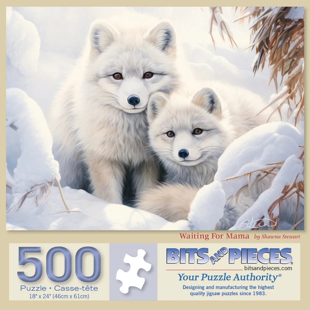 "Waiting for Mama" by Shawna Stewart invites you into a tranquil winter wonderland. Two fluffy arctic foxes huddle close, their soulful eyes filled with quiet anticipation as snow blankets the ground around them. The soft tones and exquisite details of Shawna Stewart’s artwork bring this serene moment to life, making it a joy to piece together and a celebration of nature’s tender beauty.