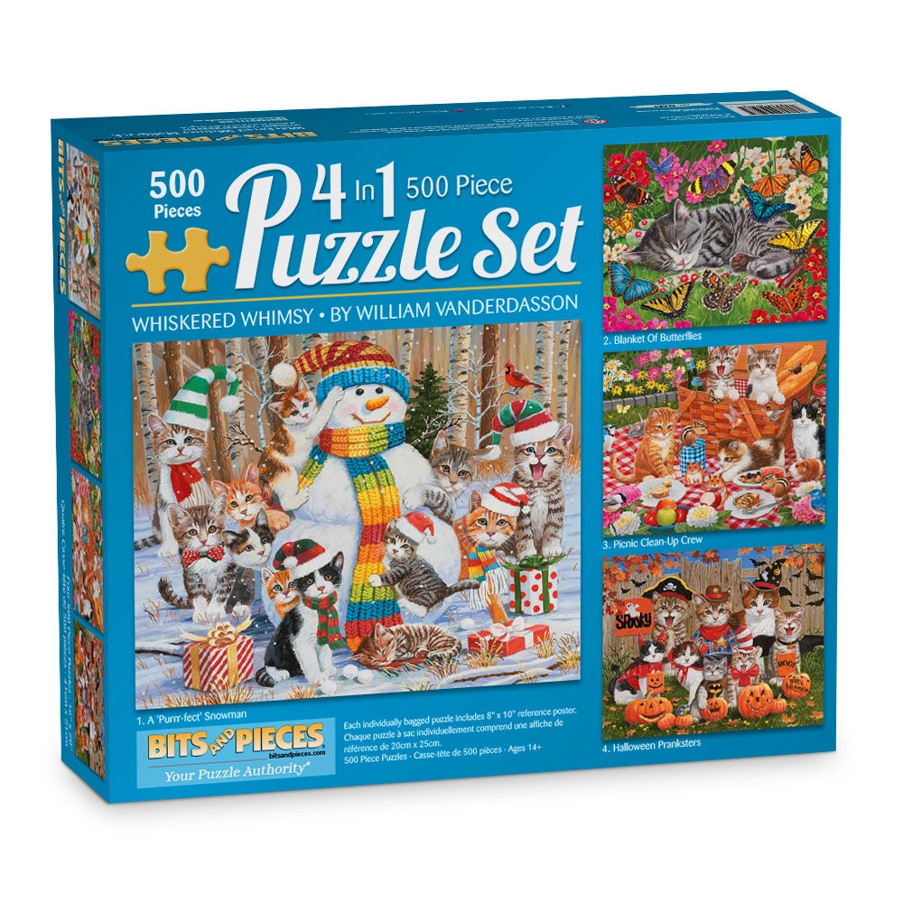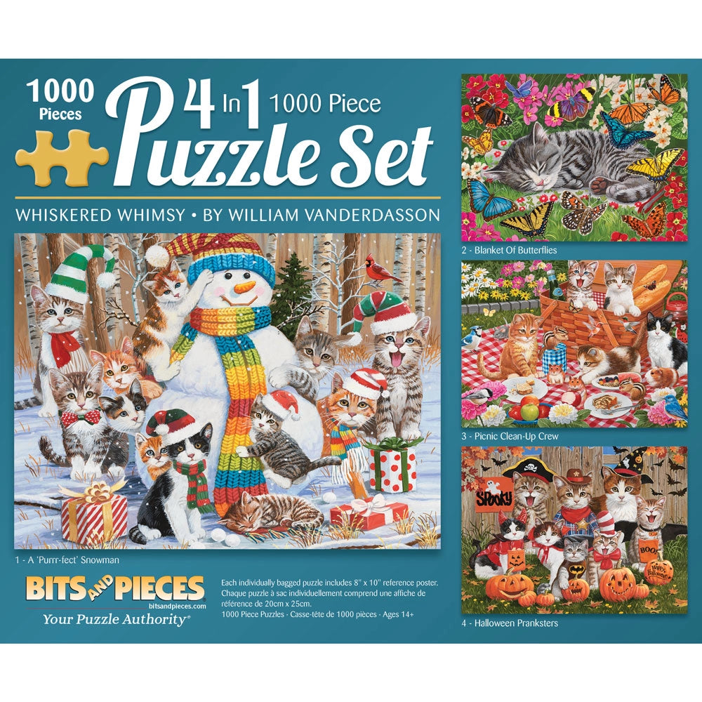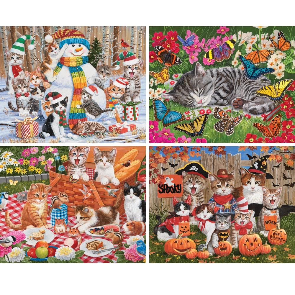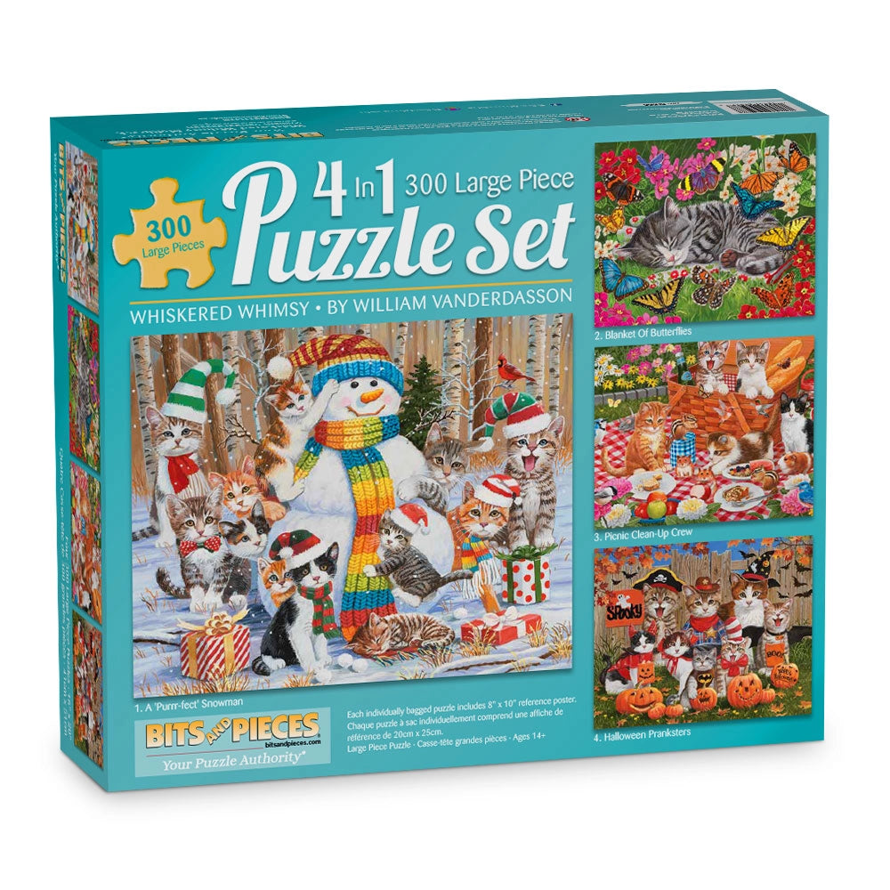 Curl up with some feline fun in Whiskered Whimsy, a 4-in-1 puzzle collection by beloved artist William Vanderdasson. This multi-pack features four individually bagged jigsaw puzzles in one box, each filled with charming cats caught in the middle of holiday fun, backyard mischief, or a cozy nap. From Halloween costumes and snowmen to picnic snacks and butterflies, every scene is packed with playful details and whiskered personalities. A purr-fect set for cat lovers and anyone who enjoys lighthearted, feel-good puzzling.