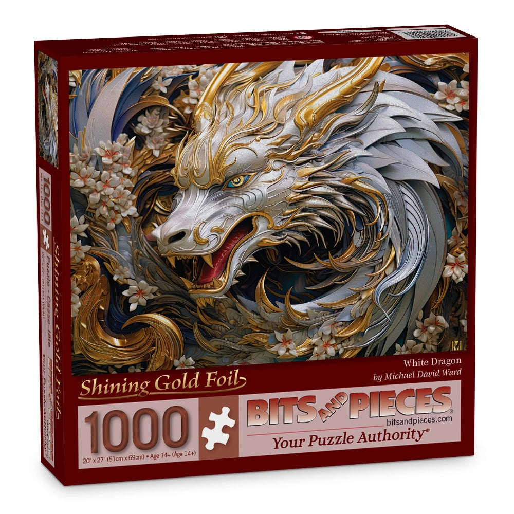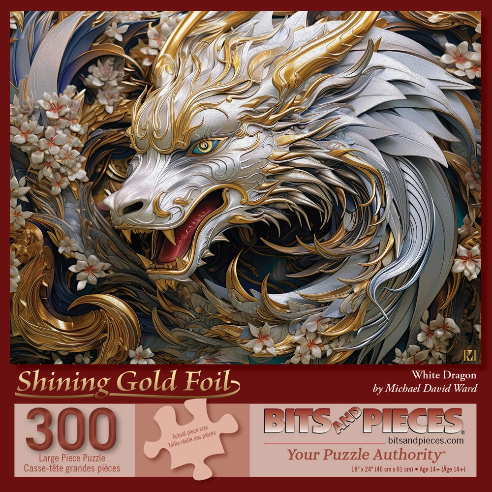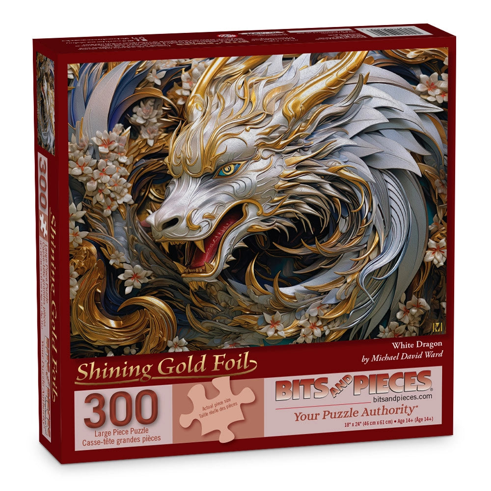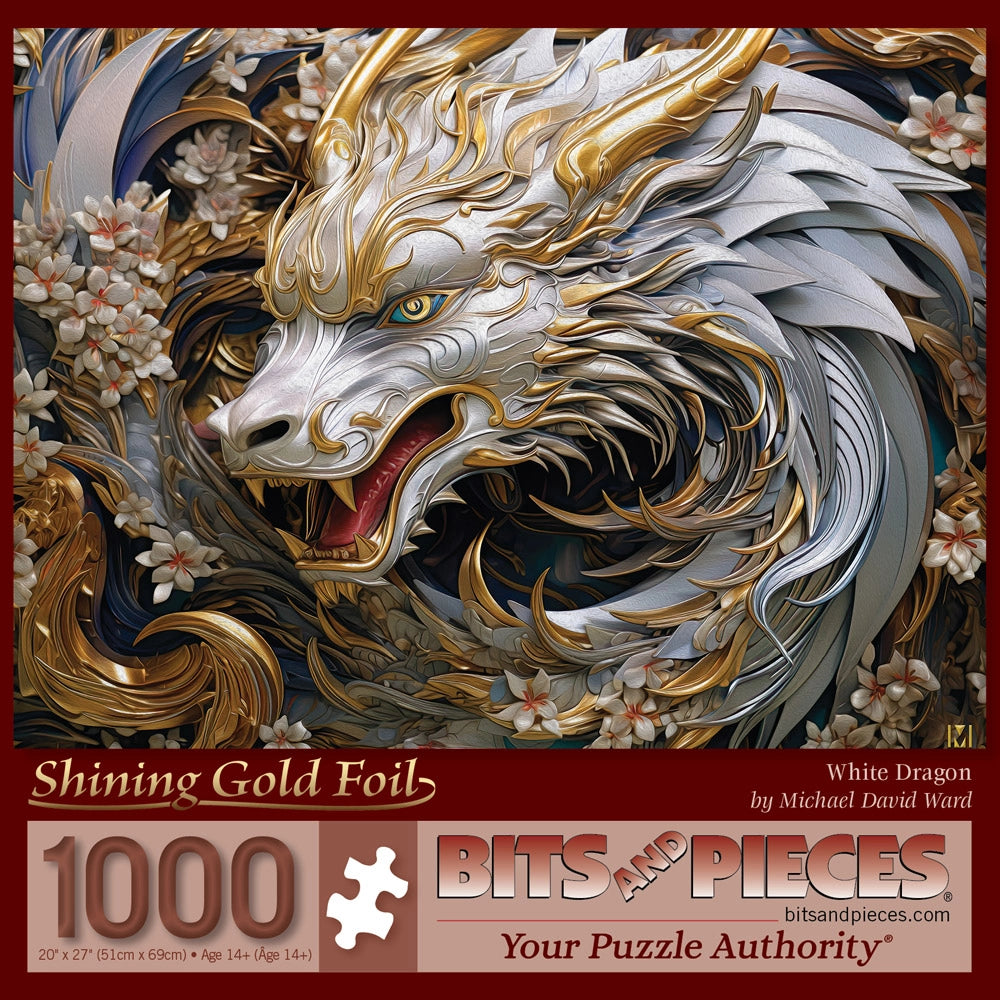 Shimmering scales and fierce energy bring the White Dragon puzzle to life. With metallic foil accents that catch the light, this powerful dragon coils in a swirl of silver and gold. Intricate textures and fantasy detail make this jigsaw puzzle a dramatic challenge for dragon fans and fantasy lovers alike.