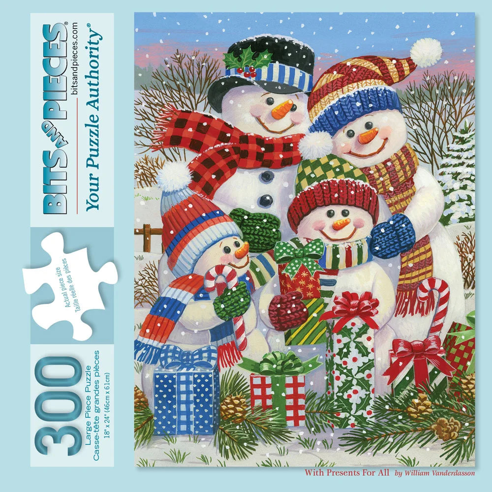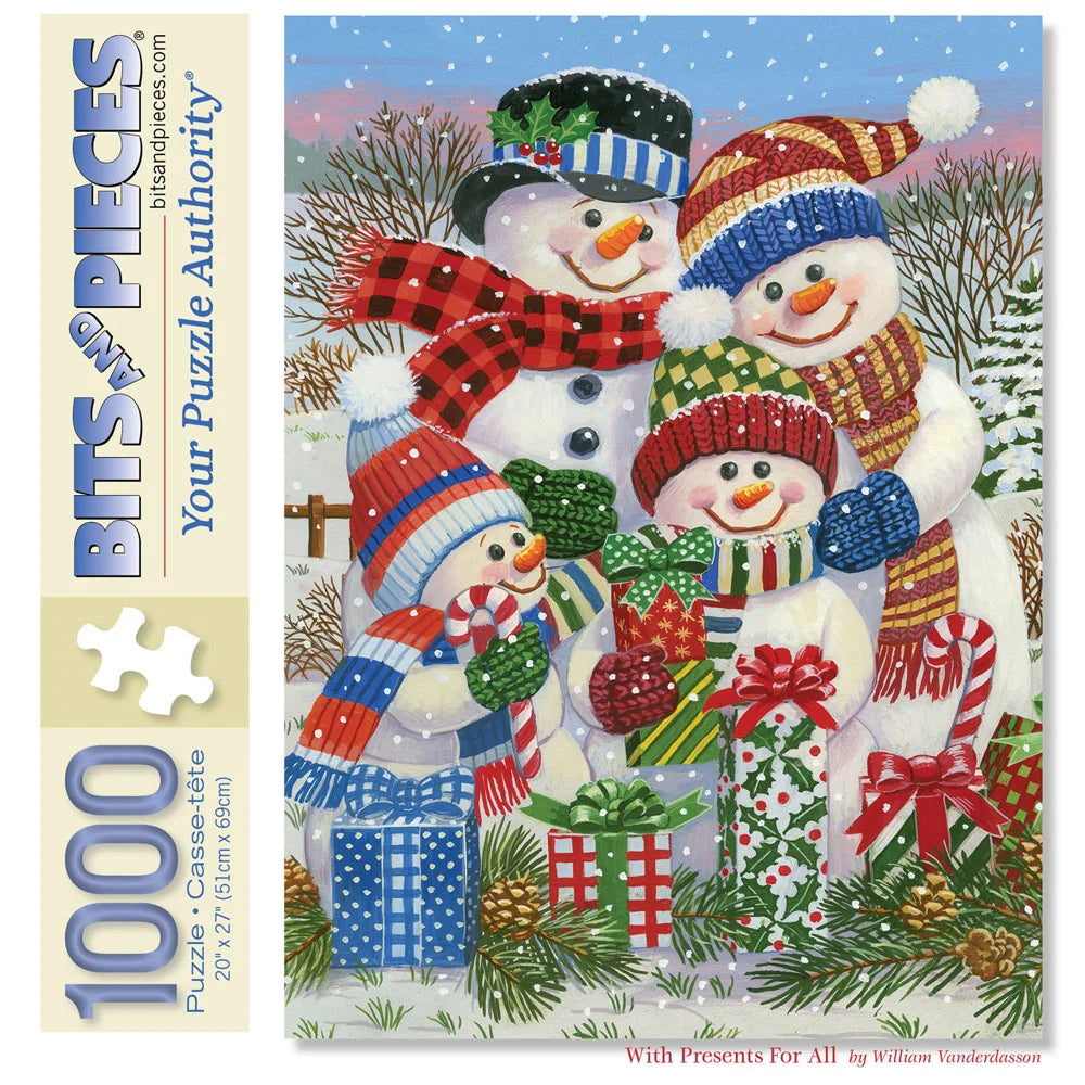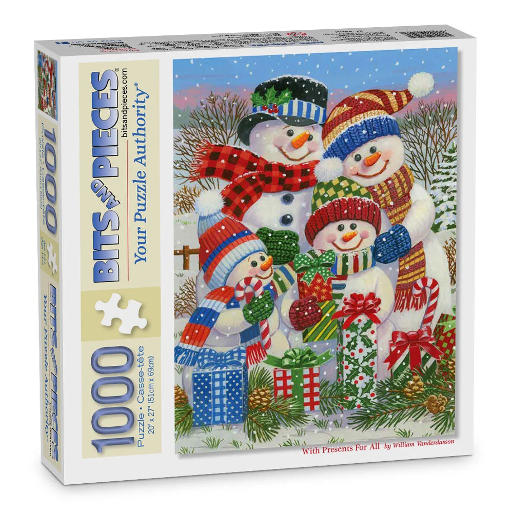 The snowmen are bundled up and bearing gifts in With Presents for All by William Vanderdasson. Wrapped in scarves and big smiles, this jolly snow-family is ready to spread joy. With twinkling lights and a snowy setting, it’s a heartwarming scene perfect for holiday puzzling.