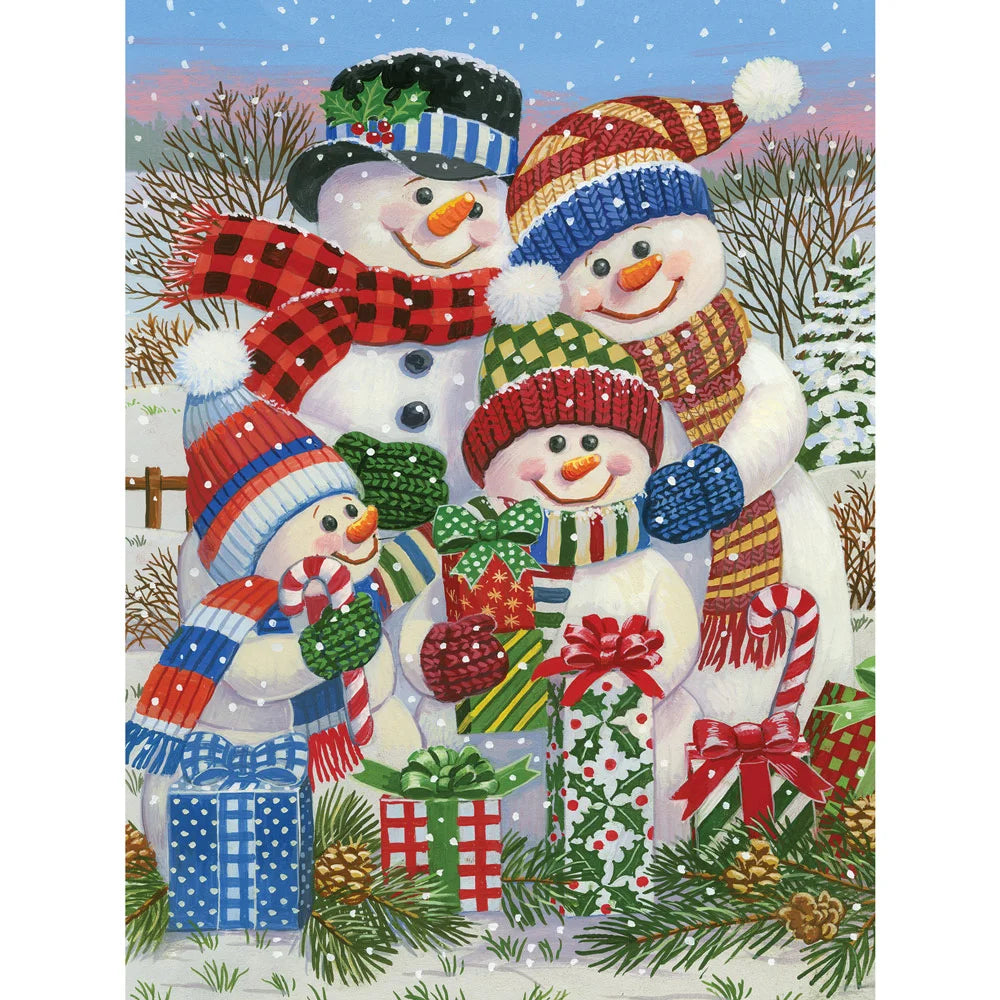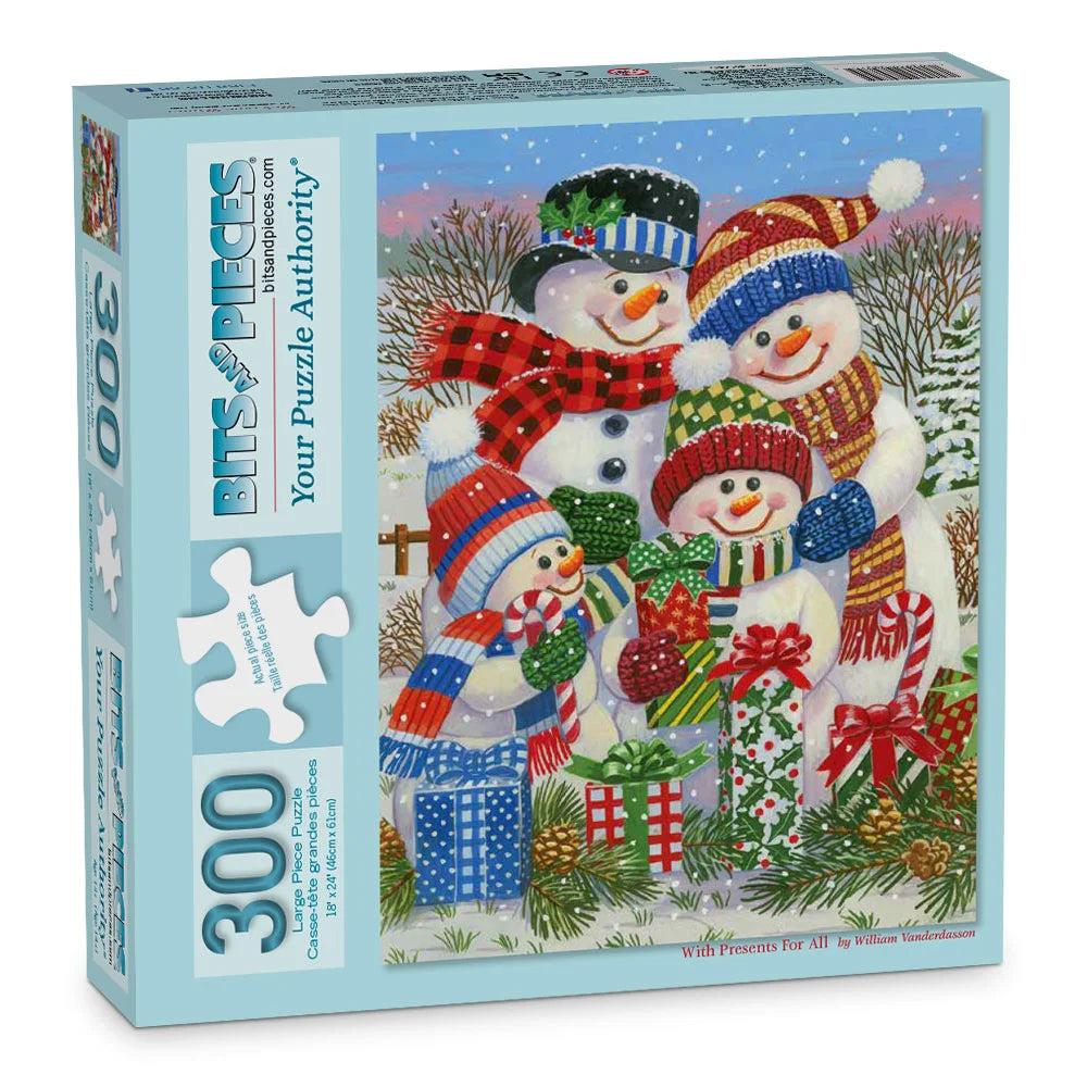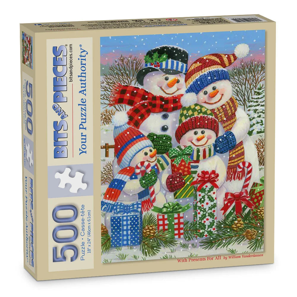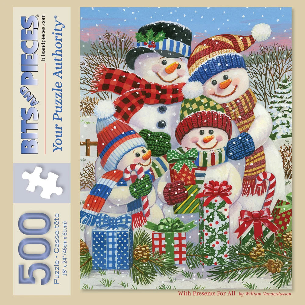The snowmen are bundled up and bearing gifts in With Presents for All by William Vanderdasson. Wrapped in scarves and big smiles, this jolly snow-family is ready to spread joy. With twinkling lights and a snowy setting, it’s a heartwarming scene perfect for holiday puzzling.
